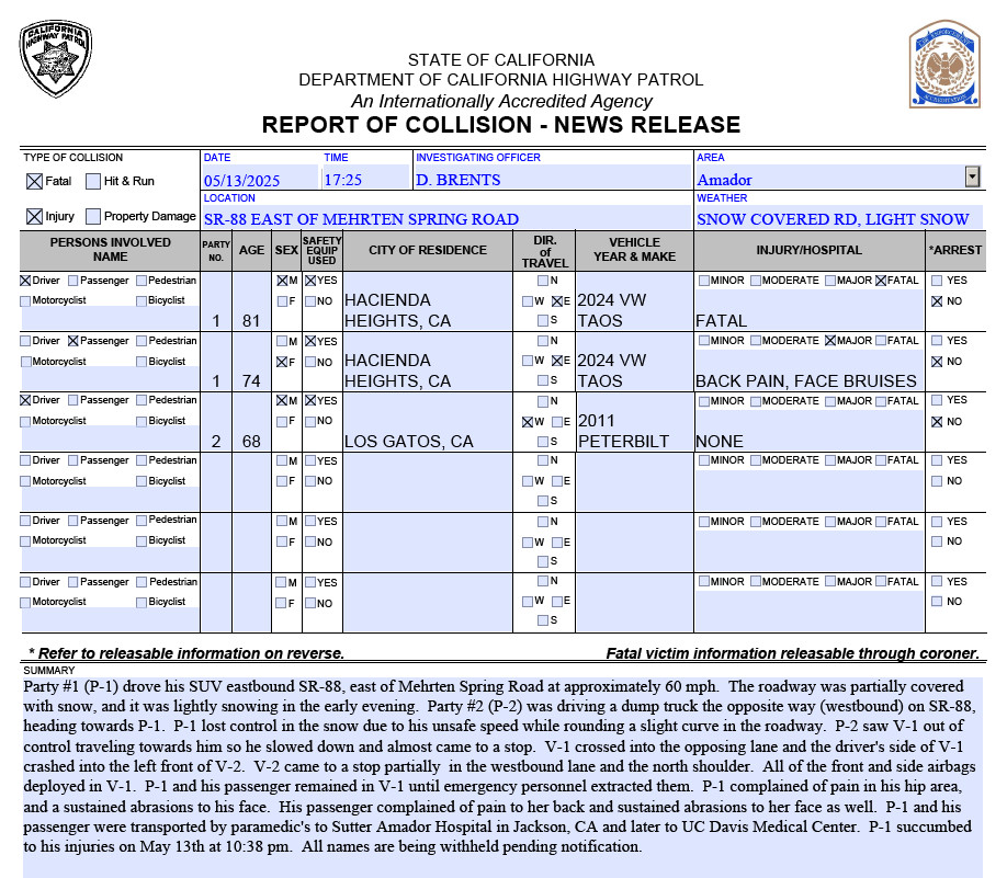 Tragedy Spring, CA…Party #1 (P-1) drove his SUV eastbound SR-88, east of Mehrten Spring Road at approximately 60 mph. The roadway was partially covered with snow, and it was lightly snowing in the early evening. Party #2 (P-2) was driving a dump truck the opposite way (westbound) on SR-88, heading towards P-1. P-1 lost control in the snow due to his unsafe speed while rounding a slight curve in the roadway. P-2 saw V-1 out of control traveling towards him so he slowed down and almost came to a stop. V-1 crossed into the opposing lane and the driver’s side of V-1 crashed into the left front of V-2. V-2 came to a stop partially in the westbound lane and the north shoulder.