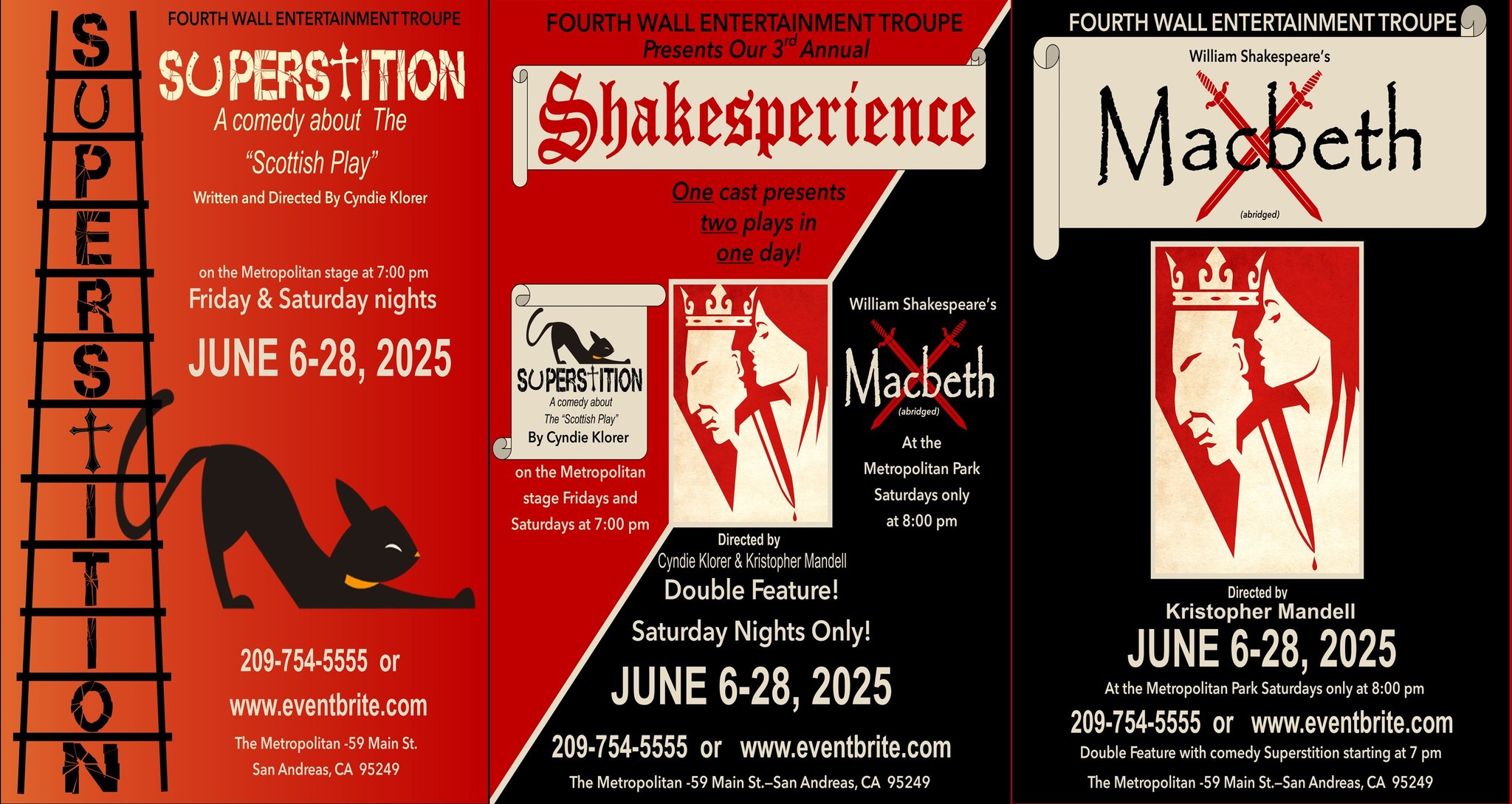 San Andreas, CA…ONE cast, TWO shows! Join us on Saturdays in June for our 3rd Annual Shakespearience double feature starting at 7 p.m. inside the Metropolitan. You’ll be entertained by the uproarious comedy, Superstition, which unfolds backstage at a community theater producing Macbeth. The actors are thrown into chaos when the stage manager accidentally utters the name “Macbeth” outside of the play, which everyone knows is strictly forbidden! Despite the stage manager’s attempts to break the curse with spinning, spitting, and swearing, strange occurrences start to unfold. Props vanish, accidents happen, and the lead actor breaks a bone! Armed with sage, rabbit’s feet, horseshoes, clovers, and a box of Lucky Charms cereal, the cast bravely navigates through the performance amidst the obvious curse.