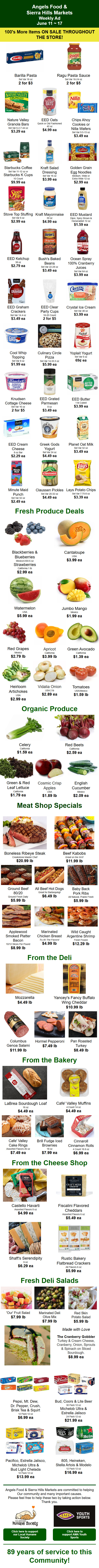 Angels Camp & Murphys, CA…Angels Food & Sierra Hills Markets Weekly Ad June 11 ~ 17! Shop Local & Save!! Grocery, Meat, Deli, Produce & Lots of Local Wines! 100’s More Items on Sale Throughout the Store!Angels Food Market, started by Harry Croshaw, has been serving the Calaveras community since 1935. Glen, Harry’s son, eventually took over the store and then passed it along to his son, Mike, who continues to operate it to this day.