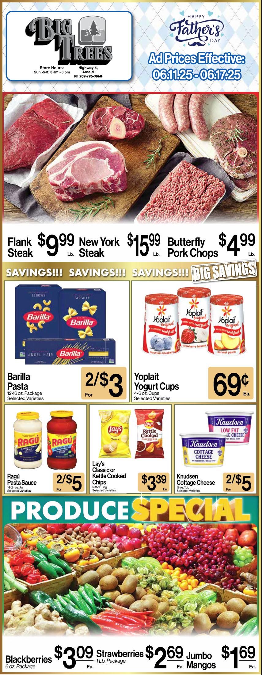 Arnold, CA…Big Trees Market Weekly Ad, Grocery, Produce, Meat & Deli Specials Through June 17th! Shop Local & Save! Big Trees Market is working hard to keep the shelves stocked for you! Part of your community for generations. Click on an image below for full sized version.
