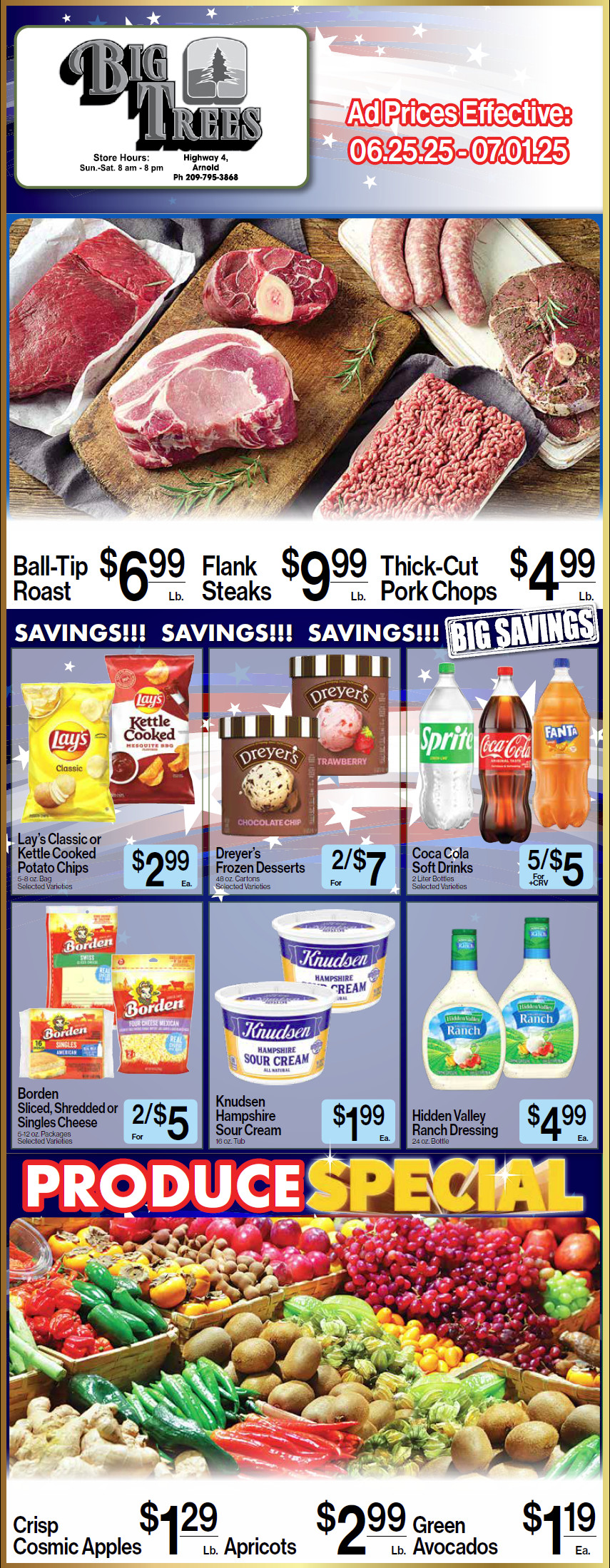 Arnold, CA…Big Trees Market Weekly Ad, Grocery, Produce, Meat & Deli Specials Through July 1st! Shop Local & Save! Big Trees Market is working hard to keep the shelves stocked for you! Part of your community for generations. Click on an image below for full sized version.