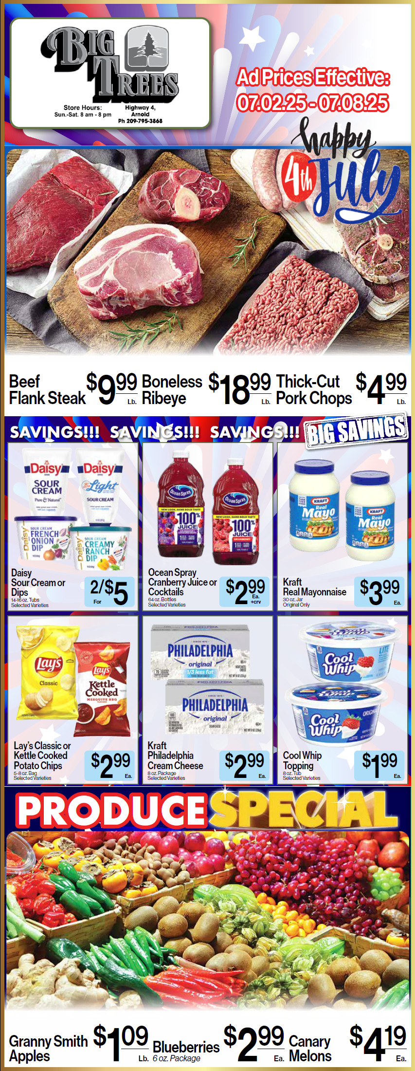 Arnold, CA…Big Trees Market Weekly Ad, Grocery, Produce, Meat & Deli Specials Through July 8th! Shop Local & Save! Big Trees Market is working hard to keep the shelves stocked for you! Part of your community for generations. Click on an image below for full sized version.