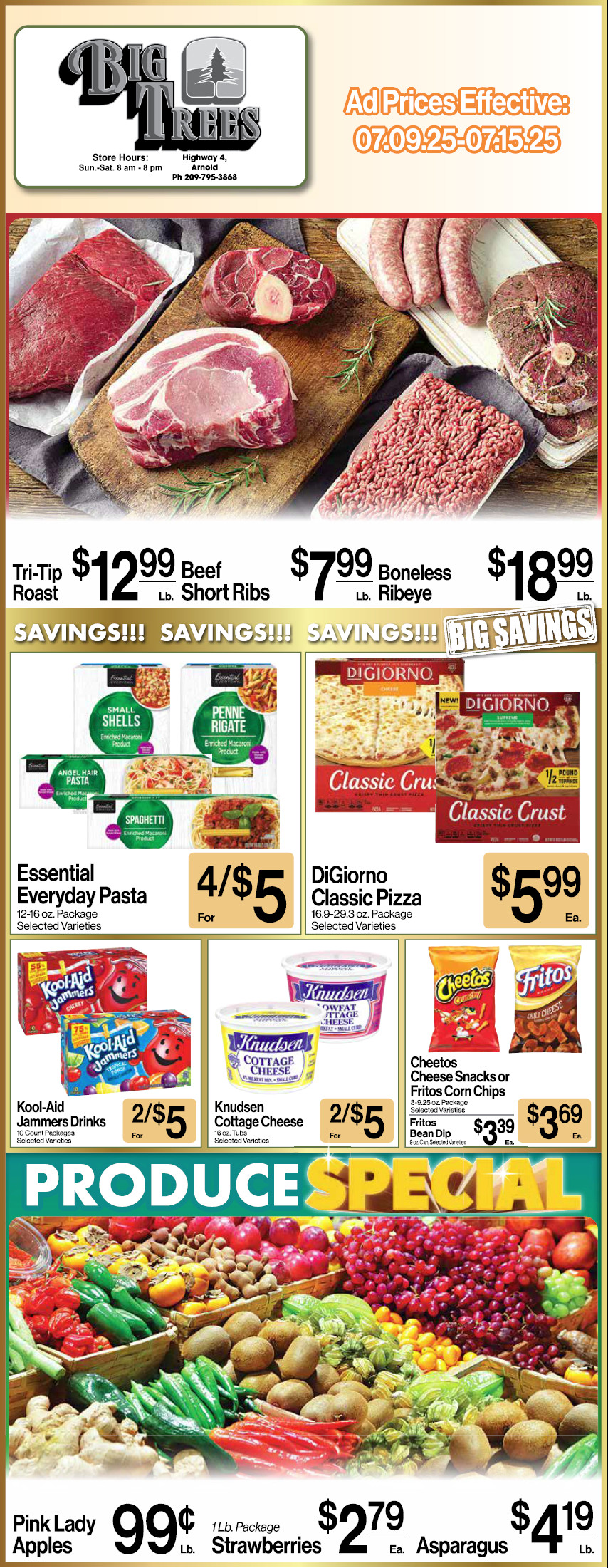 Arnold, CA…Big Trees Market Weekly Ad, Grocery, Produce, Meat & Deli Specials Through July 15th! Shop Local & Save! Big Trees Market is working hard to keep the shelves stocked for you! Part of your community for generations. Click on an image below for full sized version.