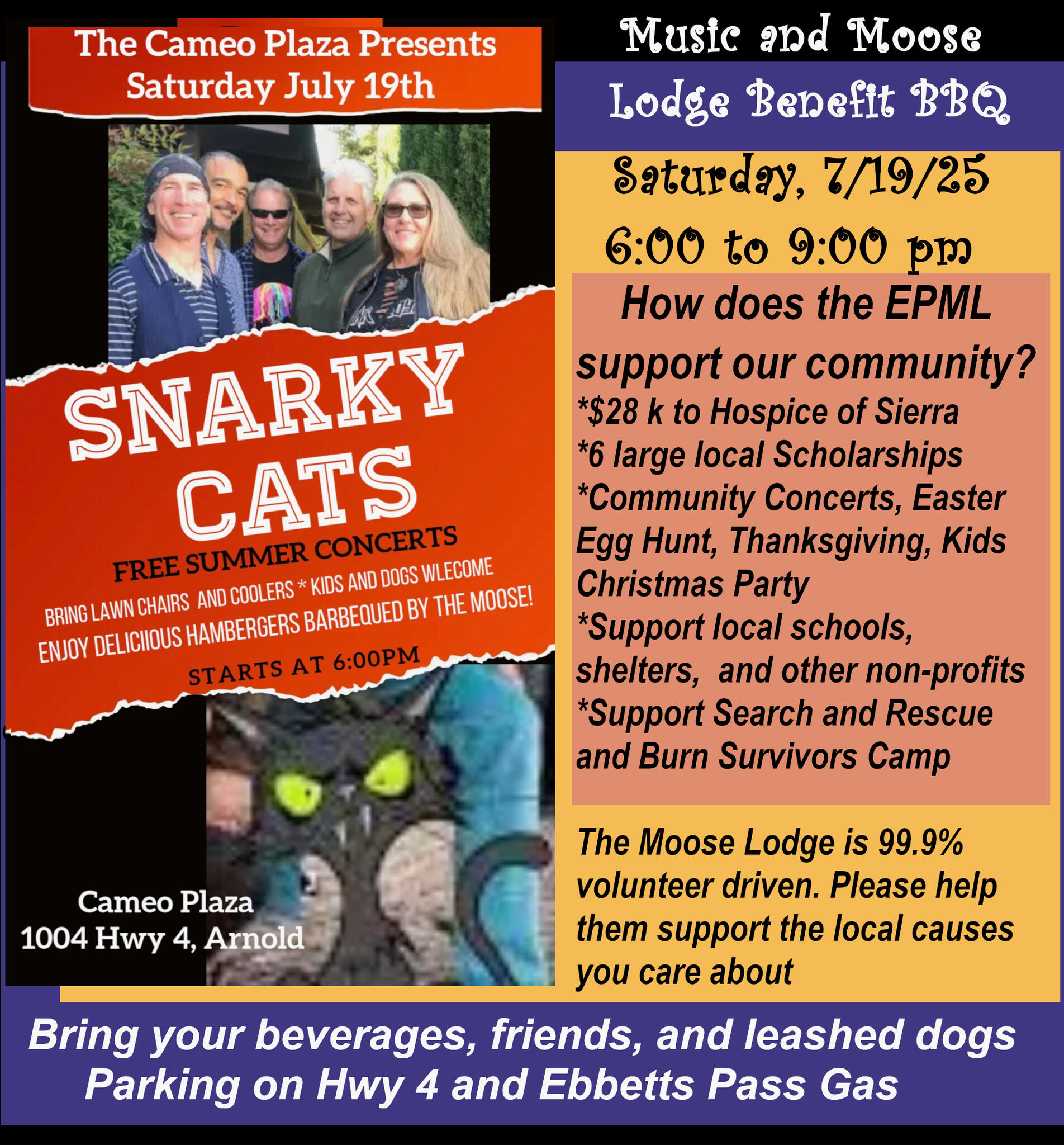 Arnold, CA…Music & Moose Benefit with Snarky Cats THIS SATURDAY July 19! The Ebbetts Pass Moose Lodge are bringing on the BBQ for this FREE concert! They do SO much for our community, and the Cameo Plaza Merchants want to give back. Please see the attached poster for a short list of what the Moose Lodge does for our LOCAL community. Show up at 6:00 with your friends, pets on a leash, chairs/blankets, beverage of choice, and empty belly!