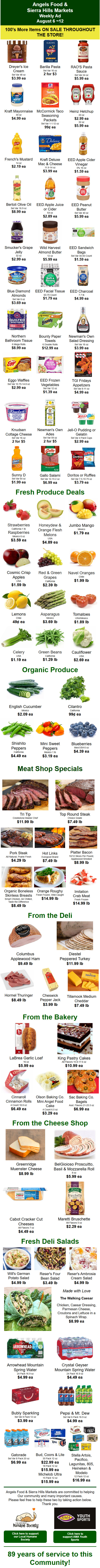 Angels Camp & Murphys, CA…Angels Food & Sierra Hills Markets Weekly Ad August 6 ~12! Shop Local & Save! Grocery, Meat, Deli, Produce & Lots of Local Wines! 100’s More Items on Sale Throughout the Store!Angels Food Market, started by Harry Croshaw, has been serving the Calaveras community since 1935. Glen, Harry’s son, eventually took over the store and then passed it along to his son, Mike, who continues to operate it to this day.