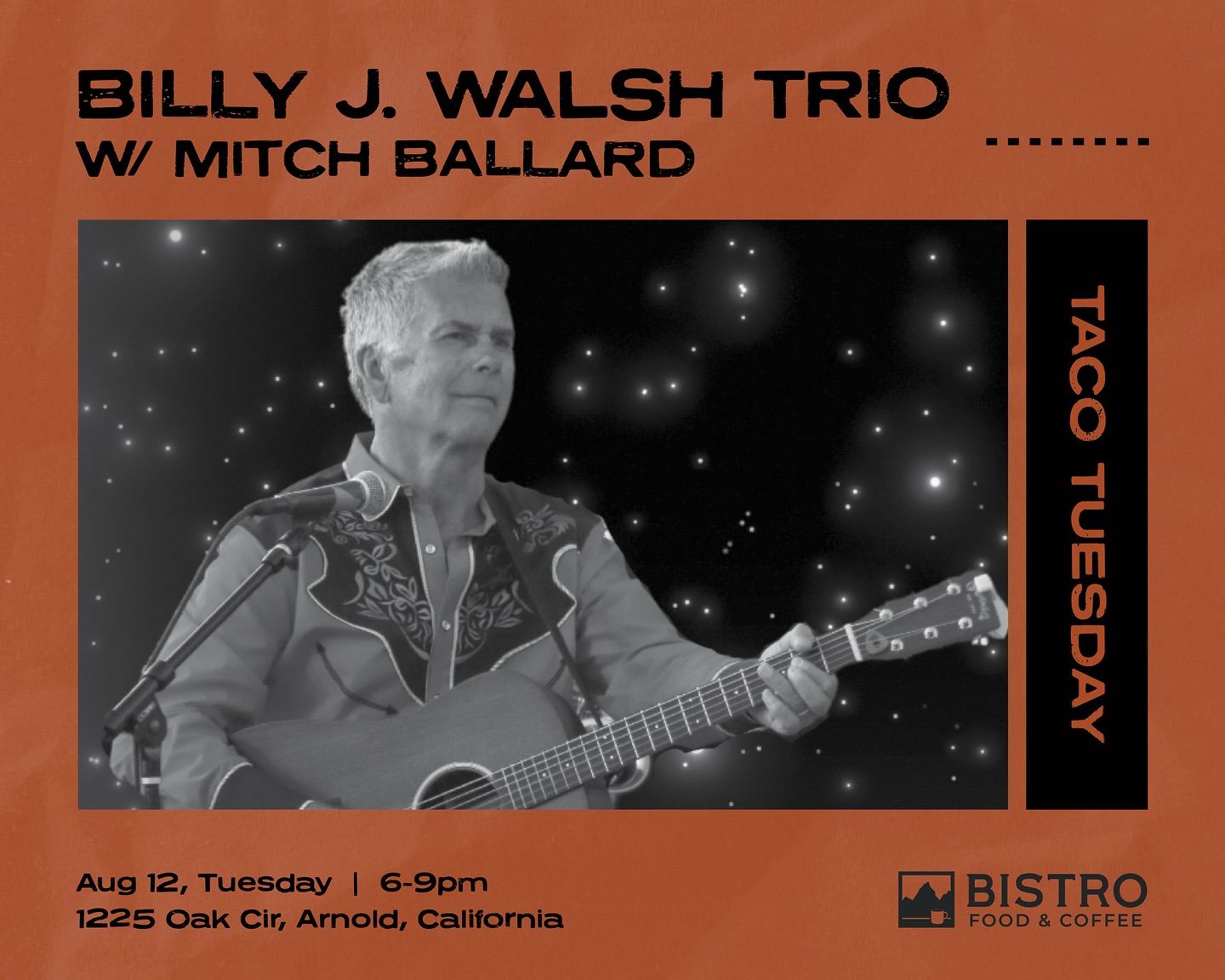 Arnold, CA…Make your Tuesday taste and sound amazing. Join us for a live concert by Billy J. Walsh Trio and Mitch Ballard at the Bistro on August 12. Enjoy fresh tacos, tasty bites, and ice-cold drinks while the music sets the perfect vibe.