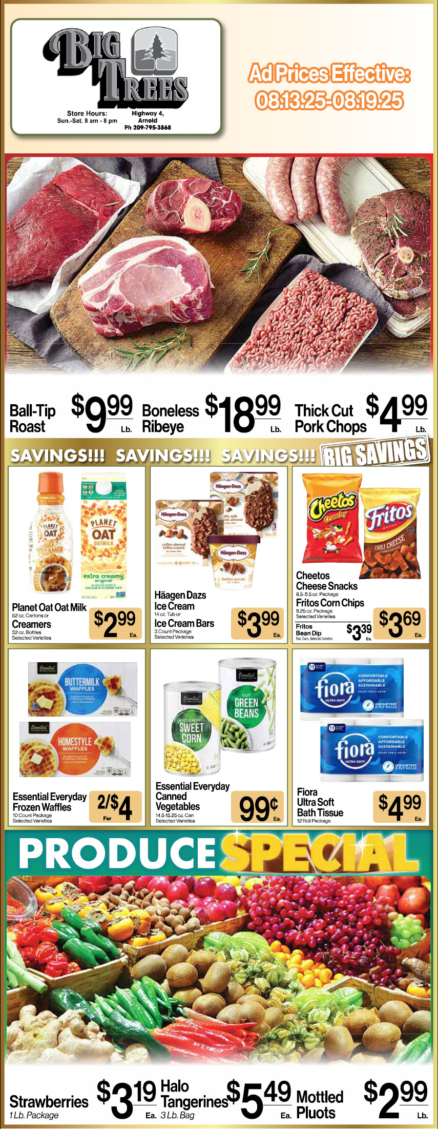 Arnold, CA…Big Trees Market Weekly Ad, Grocery, Produce, Meat & Deli Specials Through August 19th! Shop Local & Save! Big Trees Market is working hard to keep the shelves stocked for you! Part of your community for generations. Click on an image below for full sized version.