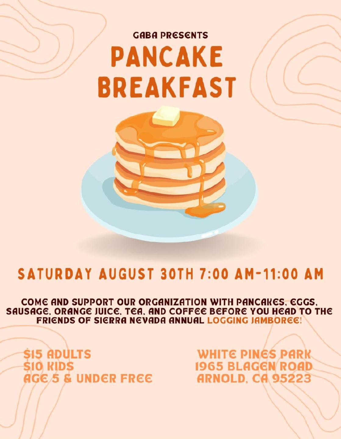 Arnold, CA…Gaba presents Pancake Breakfast! Saturday August 30th 7:00 AM-11:00 AM. Come and support our organization with pancakes, eggs, sausage, orange juice, tea, and coffee before you head to the Friends of Sierra Nevada annual logging jamboree!