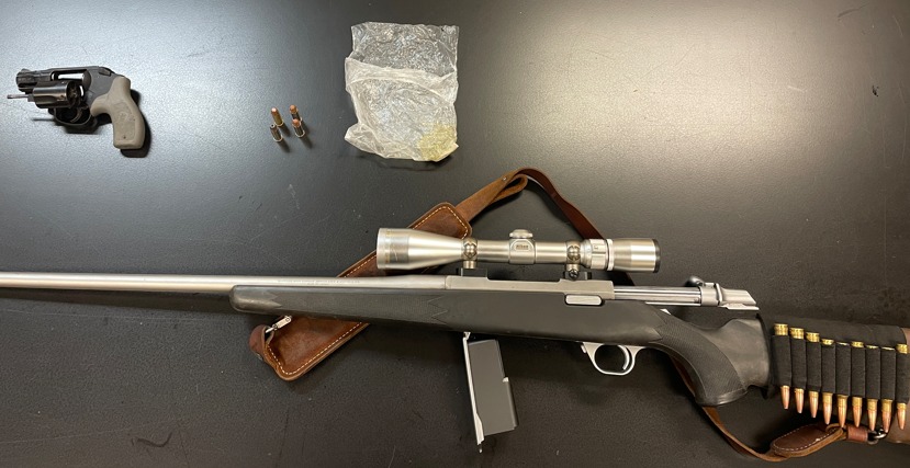 A search of the vehicle revealed a small baggie containing approximately 3 grams of marijuana in the driver’s side door panel. A .38-caliber handgun with four live rounds in the cylinder was found in the center console within reach of the driver. A second firearm, a .308-caliber rifle, was discovered in the rear hatch area. The rifle was unloaded; however, seven rounds were affixed to the stock in a shell holder. It should be noted that Kessler is prohibited from owning or possessing firearms or ammunition.