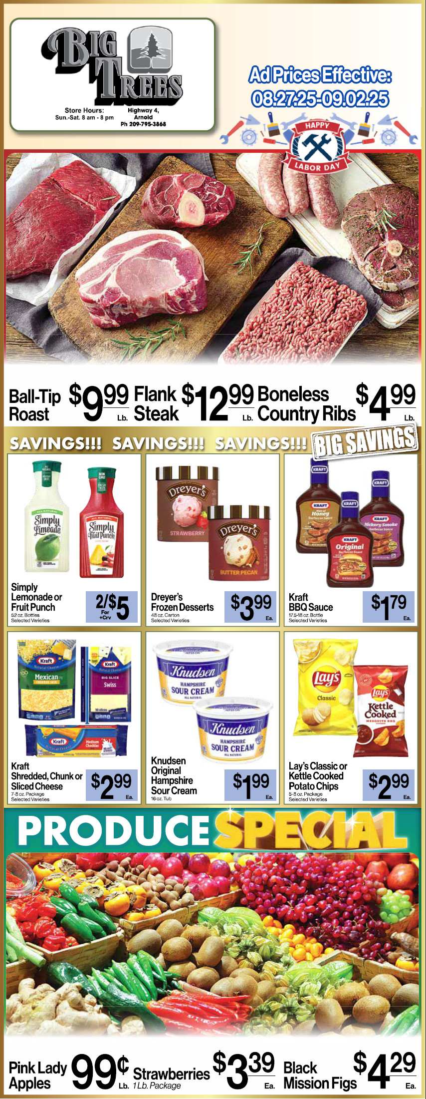 Arnold, CA…Big Trees Market Weekly Ad, Grocery, Produce, Meat & Deli Specials Through September 2nd! Shop Local & Save! Big Trees Market is working hard to keep the shelves stocked for you! Part of your community for generations. Click on an image below for full sized version.