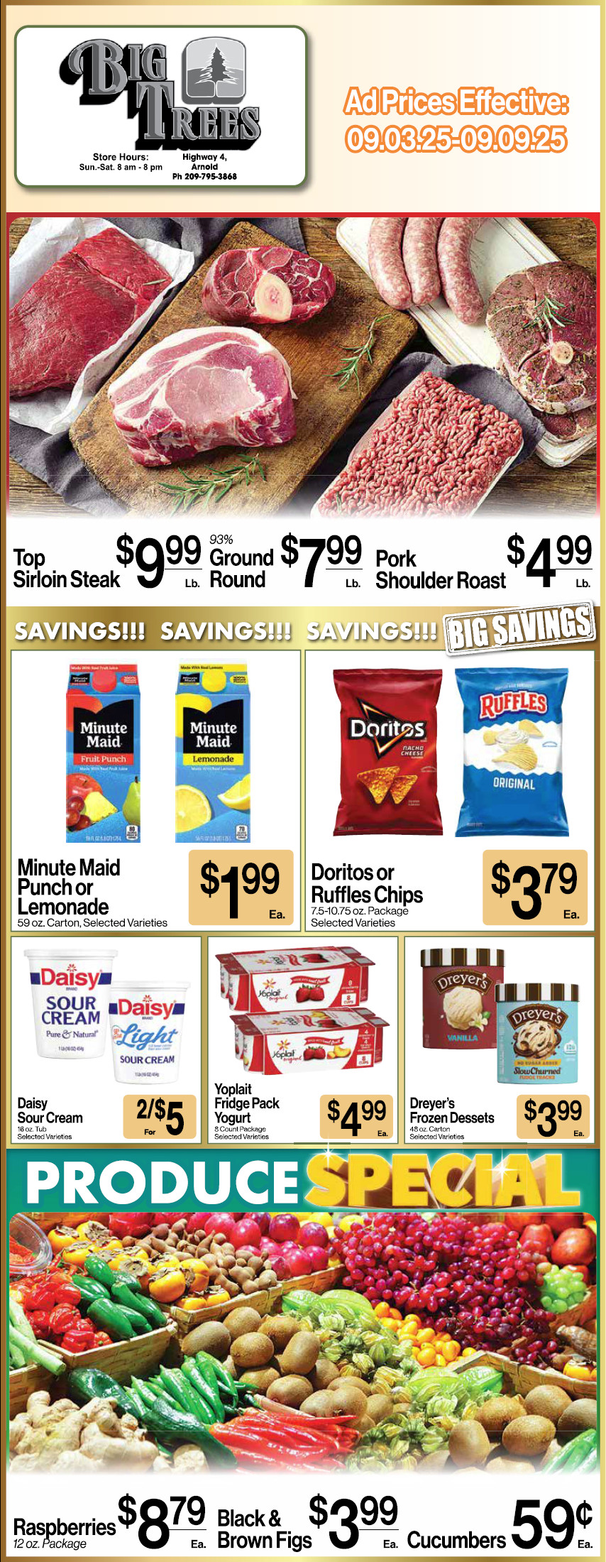 Arnold, CA…Big Trees Market Weekly Ad, Grocery, Produce, Meat & Deli Specials Through September 9th! Shop Local & Save! Big Trees Market is working hard to keep the shelves stocked for you! Part of your community for generations. Click on an image below for full sized version.
