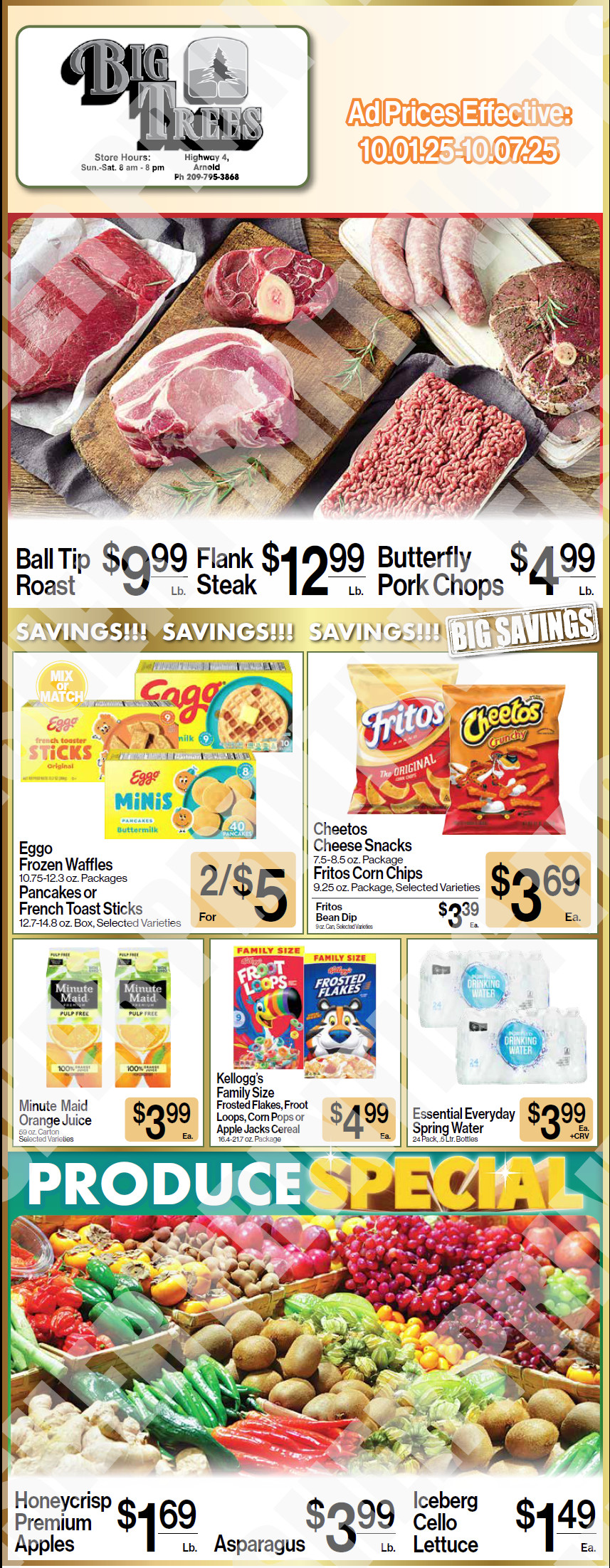 Arnold, CA…Big Trees Market Weekly Ad, Grocery, Produce, Meat & Deli Specials Through October 7th! Shop Local & Save! Big Trees Market is working hard to keep the shelves stocked for you! Part of your community for generations. Click on an image below for full sized version.