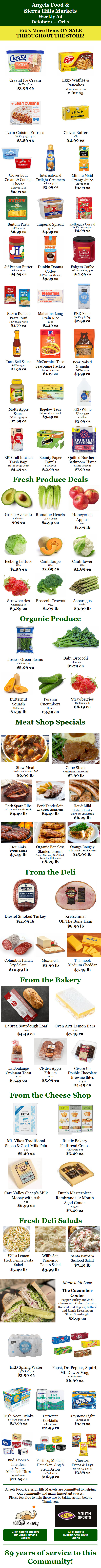 Angels Camp & Murphys, CA…Angels Food & Sierra Hills Markets Weekly Ad October 1 ~ Oct 7! Shop Local & Save!! Grocery, Meat, Deli, Produce & Lots of Local Wines! 100’s More Items on Sale Throughout the Store!Angels Food Market, started by Harry Croshaw, has been serving the Calaveras community since 1935. Glen, Harry’s son, eventually took over the store and then passed it along to his son, Mike, who continues to operate it to this day.
