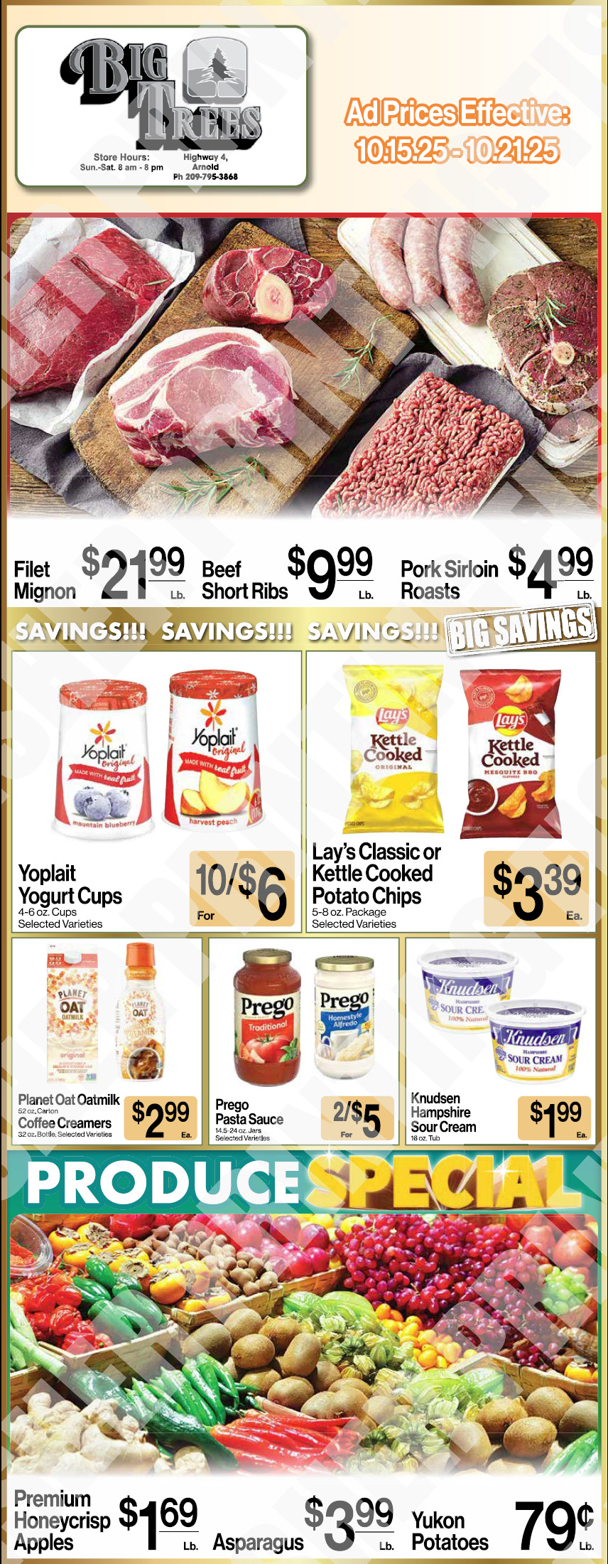 Arnold, CA…Big Trees Market Weekly Ad with Grocery, Produce, Meat & Deli Specials Through October 21st! Shop Local & Save!! Big Trees Market is working hard to keep the shelves stocked for you! Part of your community for generations. Click on an image below for full sized version.