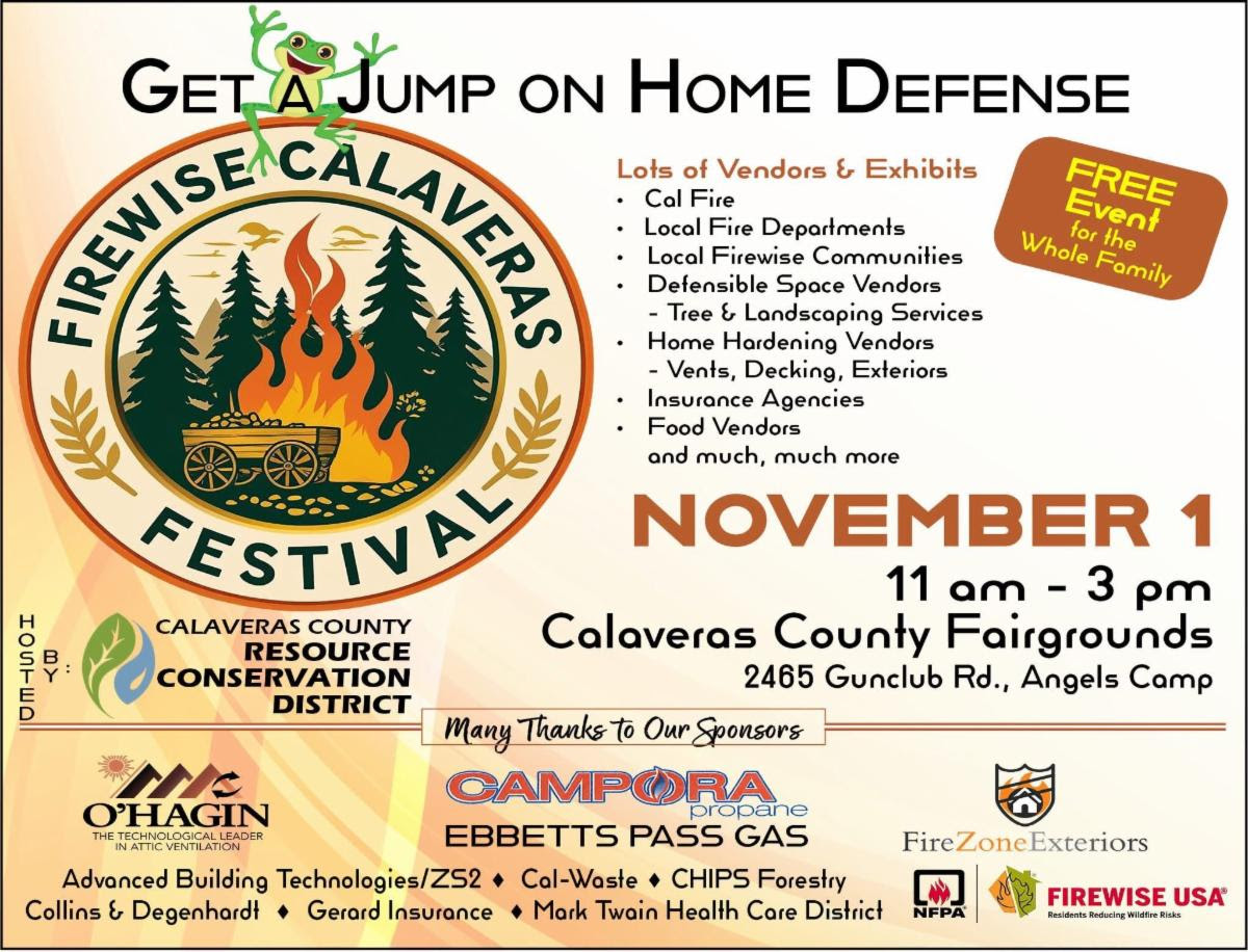 Angels Camp, CA…Get a Jump on Home Defense! 🔥 Join us for the Firewise Calaveras Festival — a free event for the whole family! 🗓 Friday, November 1, 🕚 11 AM – 3 PM, 📍 Calaveras County Fairgrounds, 2465 Gunclub Rd., Angels Camp.