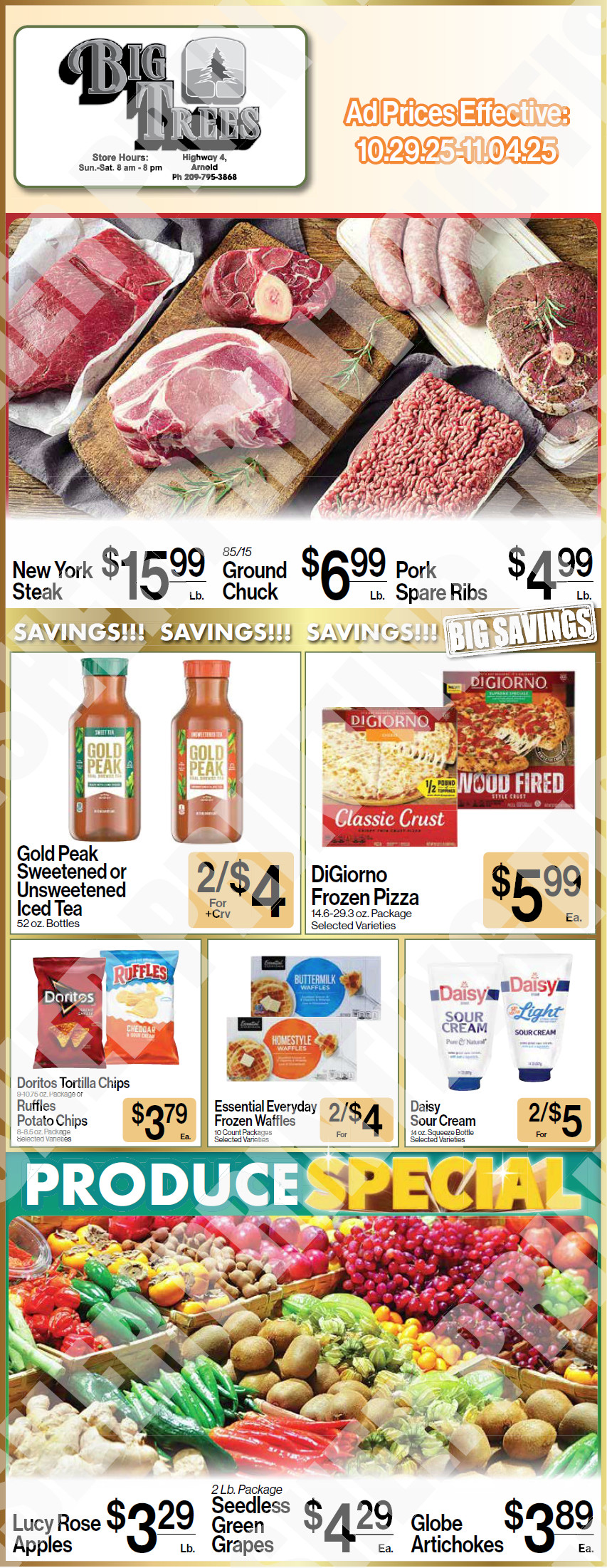 Arnold, CA…Big Trees Market Weekly Ad with Grocery, Produce, Meat & Deli Specials Through November 4th! Shop Local & Save!! Big Trees Market is working hard to keep the shelves stocked for you! Part of your community for generations. Click on an image below for full sized version.