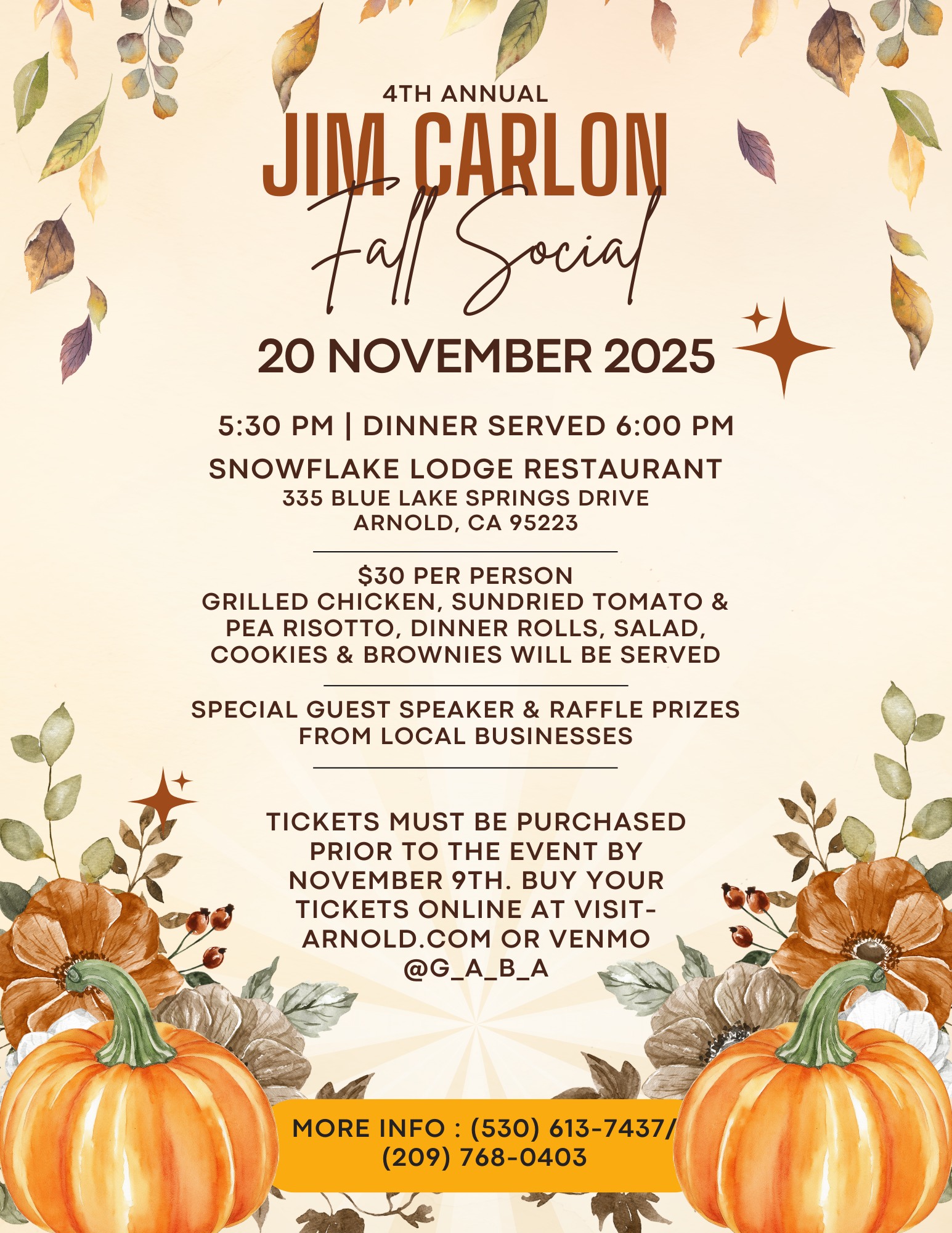 Arnold, CA…Join us for an evening of great food, community connection, and celebration at our 4th Annual Fall Social! Thursday, November 20, 2025, Social Hour Begins at 5:30 PM | Dinner Served at 6:00 PM, Snowflake Lodge Restaurant, 335 Blue Lake Springs Drive, Arnold, CA 95223