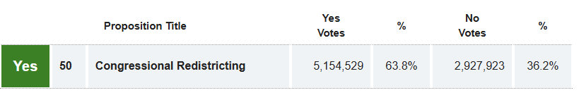 Prop 50 Congressional Redistricting Yes, 5,154,529 63.8% No, 2,927,923 36.2%