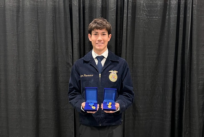 Angels Camp, CA…Senior Peyton Heermance earned national honors last Friday October 31st in Indianapolis when he was declared the 2025 National FFA Agricultural Proficiency in Veterinary Science Champion at the 98th National FFA Convention & Expo. Heermance was also named the California FFA State Veterinary Science Proficiency Award