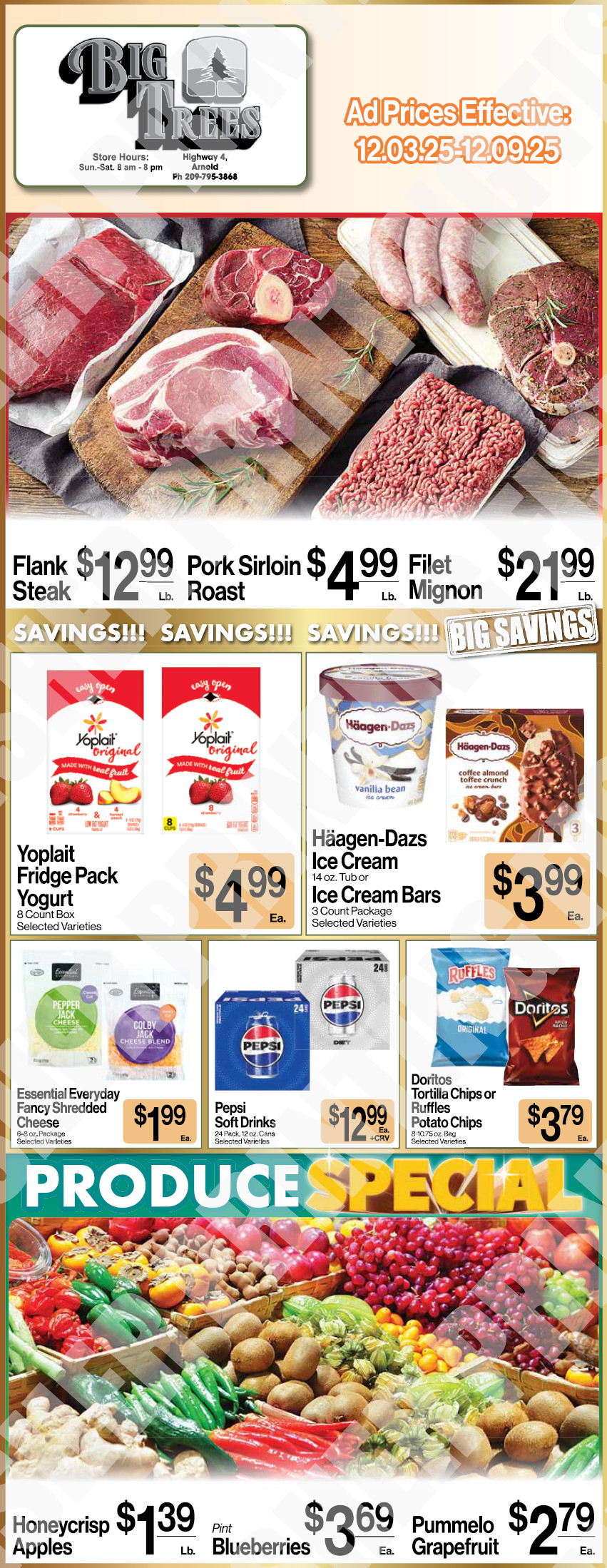 Arnold, CA…Big Trees Market Weekly Ad with Grocery, Produce, Meat & Deli Specials Through December 9th! Shop Local & Save!! Big Trees Market is working hard to keep the shelves stocked for you! Part of your community for generations. Click on an image below for full sized version.