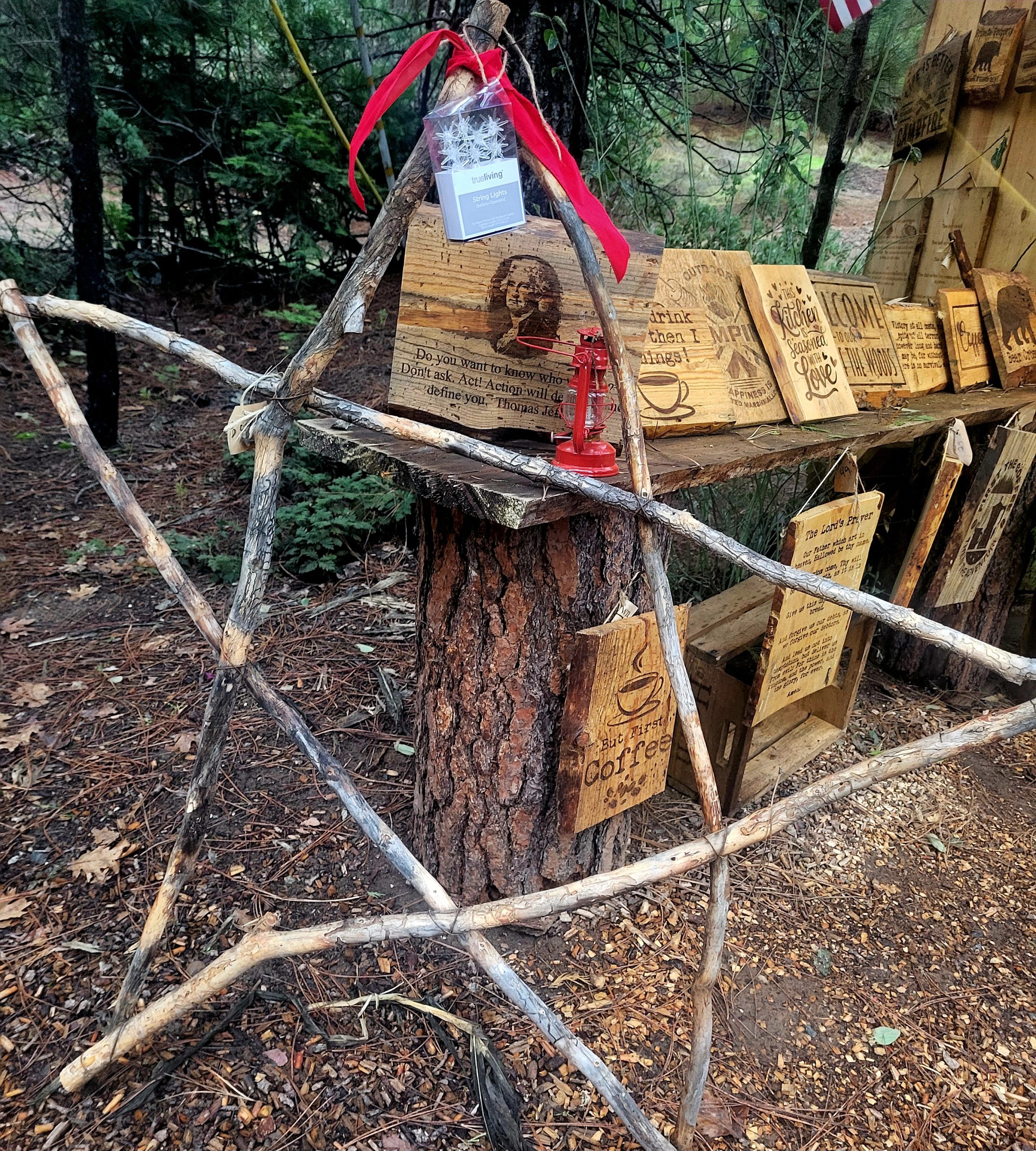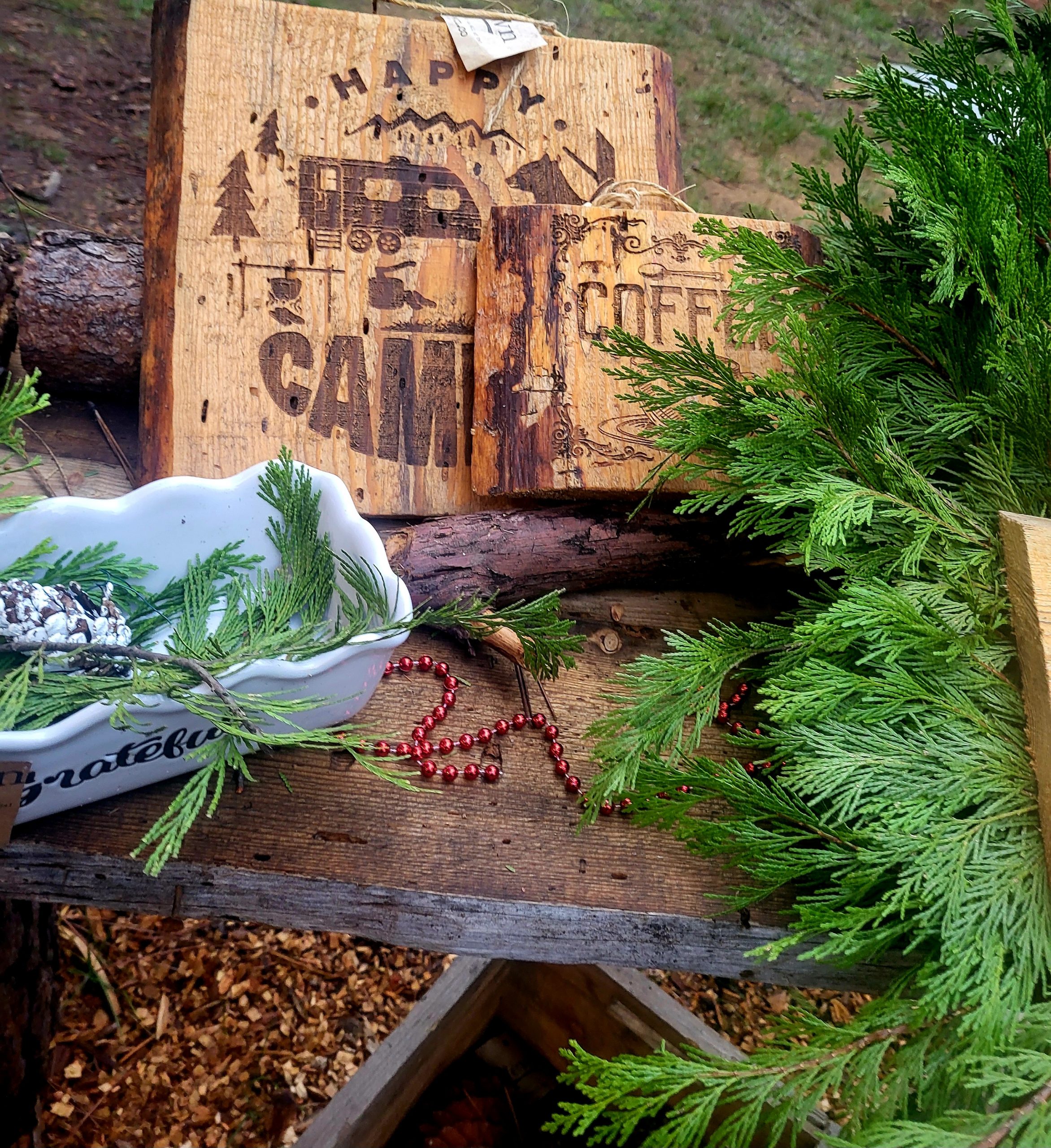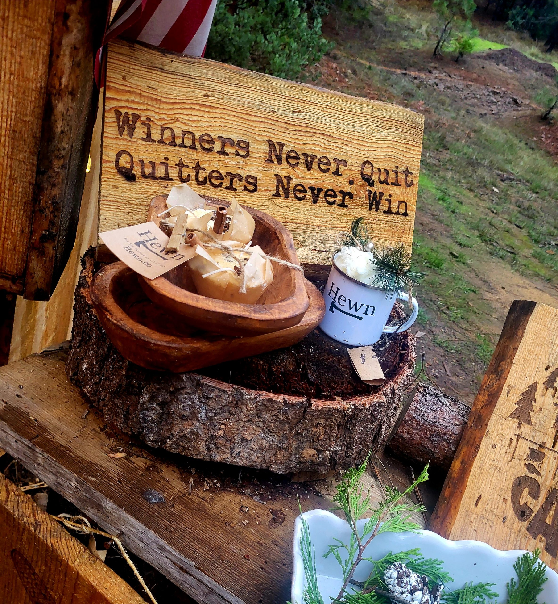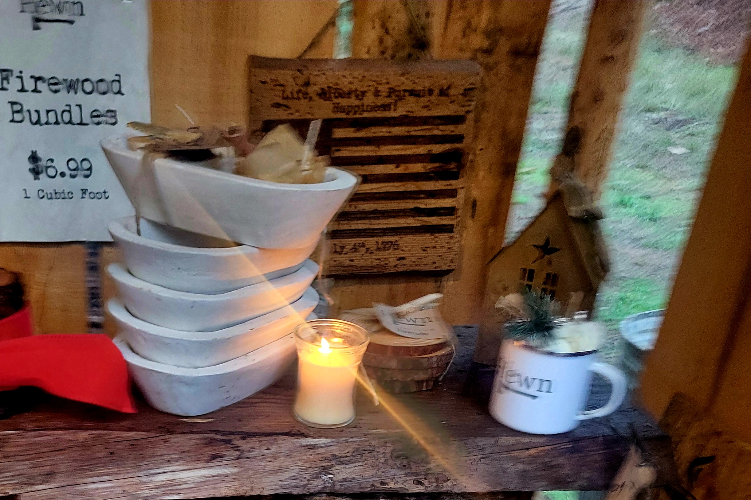 Arnold, CA…The Hewn Woodshed is open until 8pm tonight and Christmas eve for your last minute shopping needs! We offer Rustic Handcrafted Gifts. Candles, Signs, Amish style wooden dough bowls,Coasters,and more!