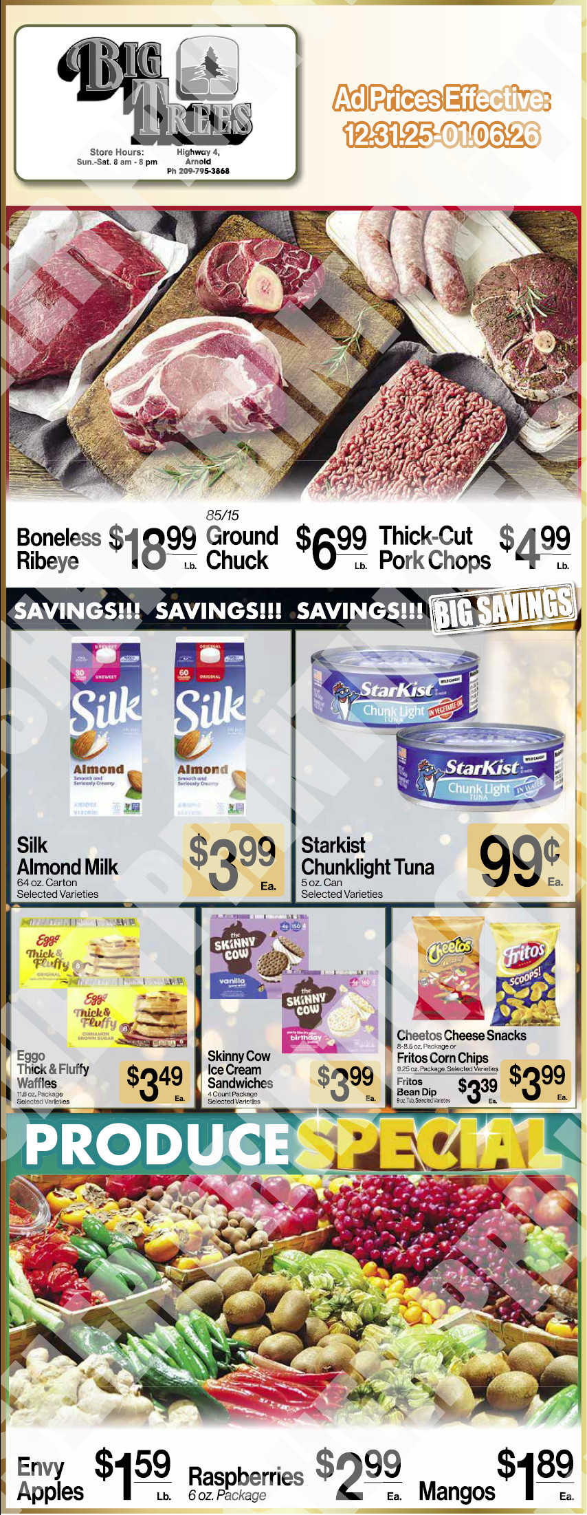 Arnold, CA…Big Trees Market Weekly Ad with Grocery, Produce, Meat & Deli Specials Through January 6th! Shop Local & Save!! Big Trees Market is working hard to keep the shelves stocked for you! Part of your community for generations. Click on an image below for full sized version.