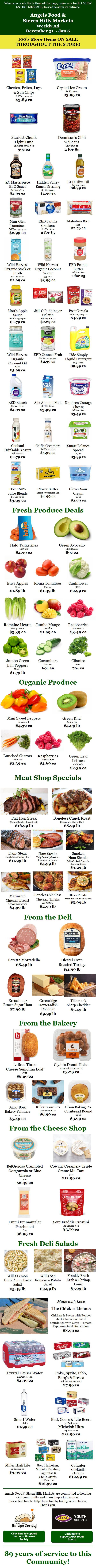 Angels Camp & Murphys, CA…Angels Food & Sierra Hills Markets Big Christmas Ad December 17 ~ December 31! Shop Local & Save!! Grocery, Meat, Deli, Produce & Lots of Local Wines! 100’s More Items on Sale Throughout the Store!Angels Food Market, started by Harry Croshaw, has been serving the Calaveras community since 1935. Glen, Harry’s son, eventually took over the store and then passed it along to his son, Mike, who continues to operate it to this day.
