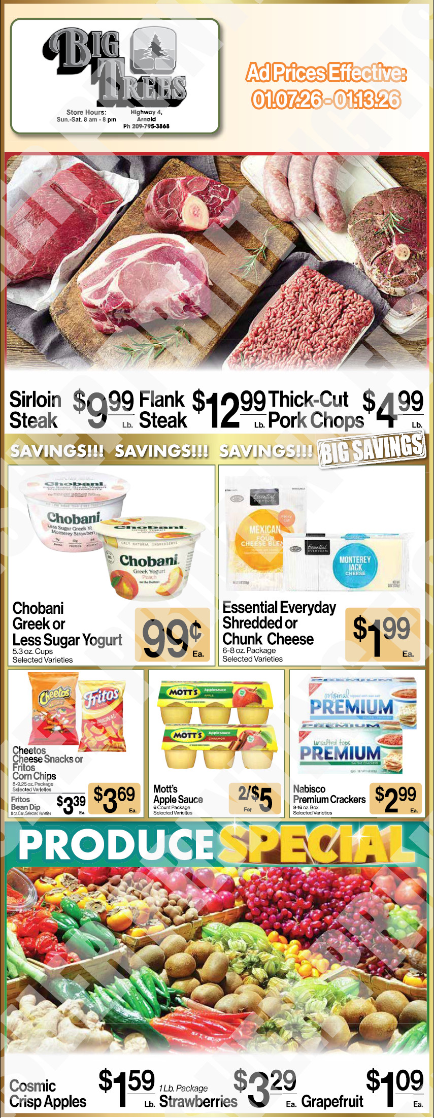 Arnold, CA…Big Trees Market Weekly Ad with Grocery, Produce, Meat & Deli Specials Through January 13th! Shop Local & Save!! Big Trees Market is working hard to keep the shelves stocked for you! Part of your community for generations. Click on an image below for full sized version.