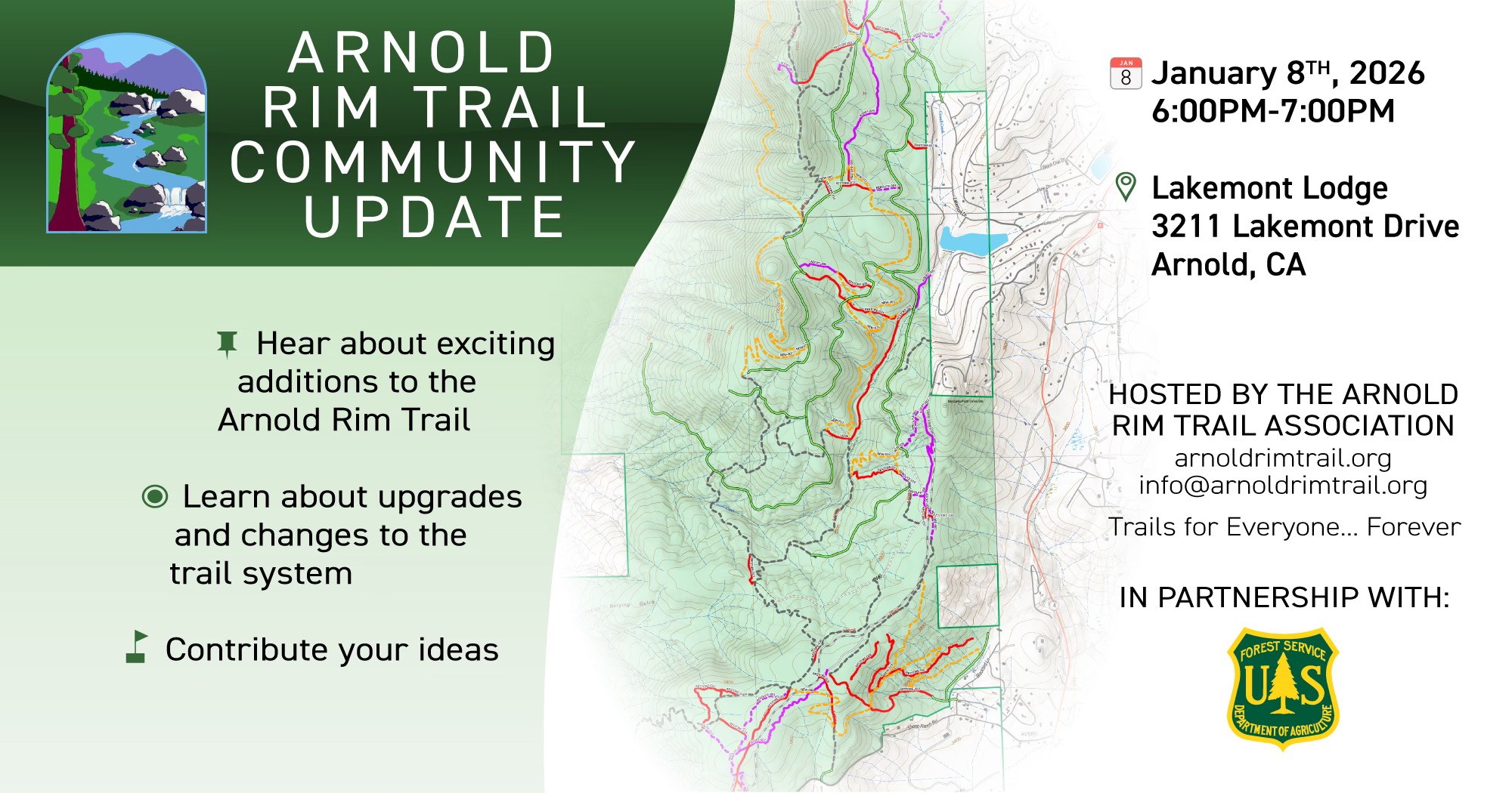Arnold, CA…Join us, January 8th, 2026 – 6PM-7PM for an Arnold Rim Trail Community Update. Hear about exciting additions to the Arnold Rim Trail. Learn about upgrades and changes to the trail system. Contribute your ideas. Lakemont Lodge – 3211 Lakemont Drive, Arnold CA. Hosted by The Arnold Rim Trail Association. In partnership with the US Forest Service.