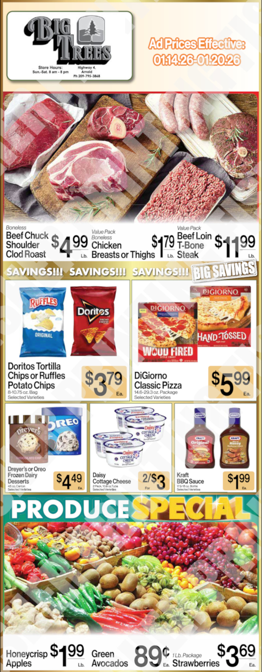 Arnold, CA…Big Trees Market Weekly Ad with Grocery, Produce, Meat & Deli Specials Through January 20th! Shop Local & Save!! Big Trees Market is working hard to keep the shelves stocked for you! Part of your community for generations. Click on an image below for full sized version.