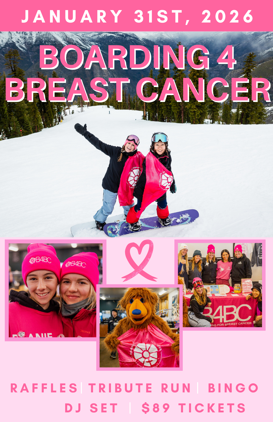 Bear Valley, CA…Join us for a day full of fun and prizes for a great cause. Boarding For Breast Cancer (B4BC) is a 501 (C) 3 non-profit foundation that advocates early detection and a healthy, active lifestyle as the best means for breast cancer prevention. We’ll have a B4BC bingo, merch you won’t want leave without, and AWESOME prizes to give away.