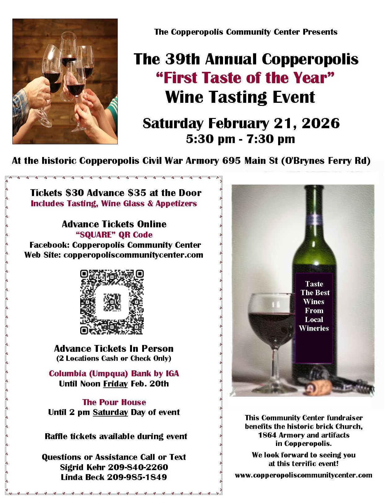 Copperopolis, CA…The Copperopolis Community Center is sponsoring their 39th Annual First Taste of the Year on Saturday, February 21, 2026. The event will be at the Copperopolis Armory from 5:30 – 7:30 pm, 695 Main St in Copperopolis. This will be an indoor event.