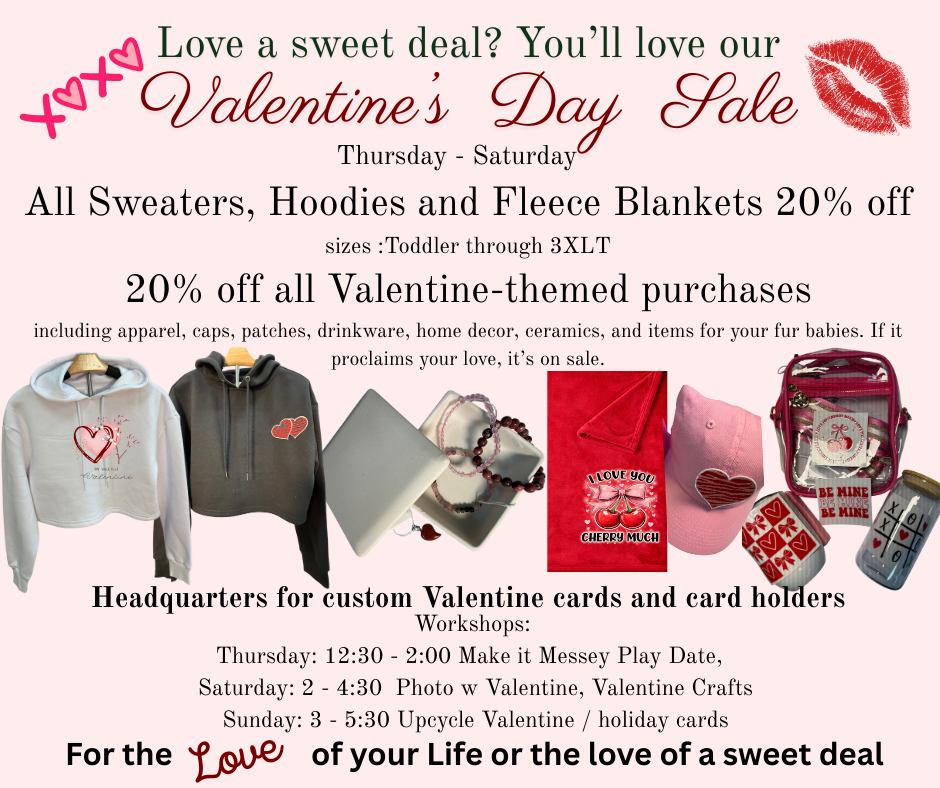 Saturday Session – 2 – 4:30 : Photo Finish – Get a Selfie with your Valentine using our holiday backdrop. Print 2 copies or get 20% off photo sublimation on one of our 30 sublimation items, including tumblers, wind spinners, planters, bottle openers, cutting boards, and kitchenware.
