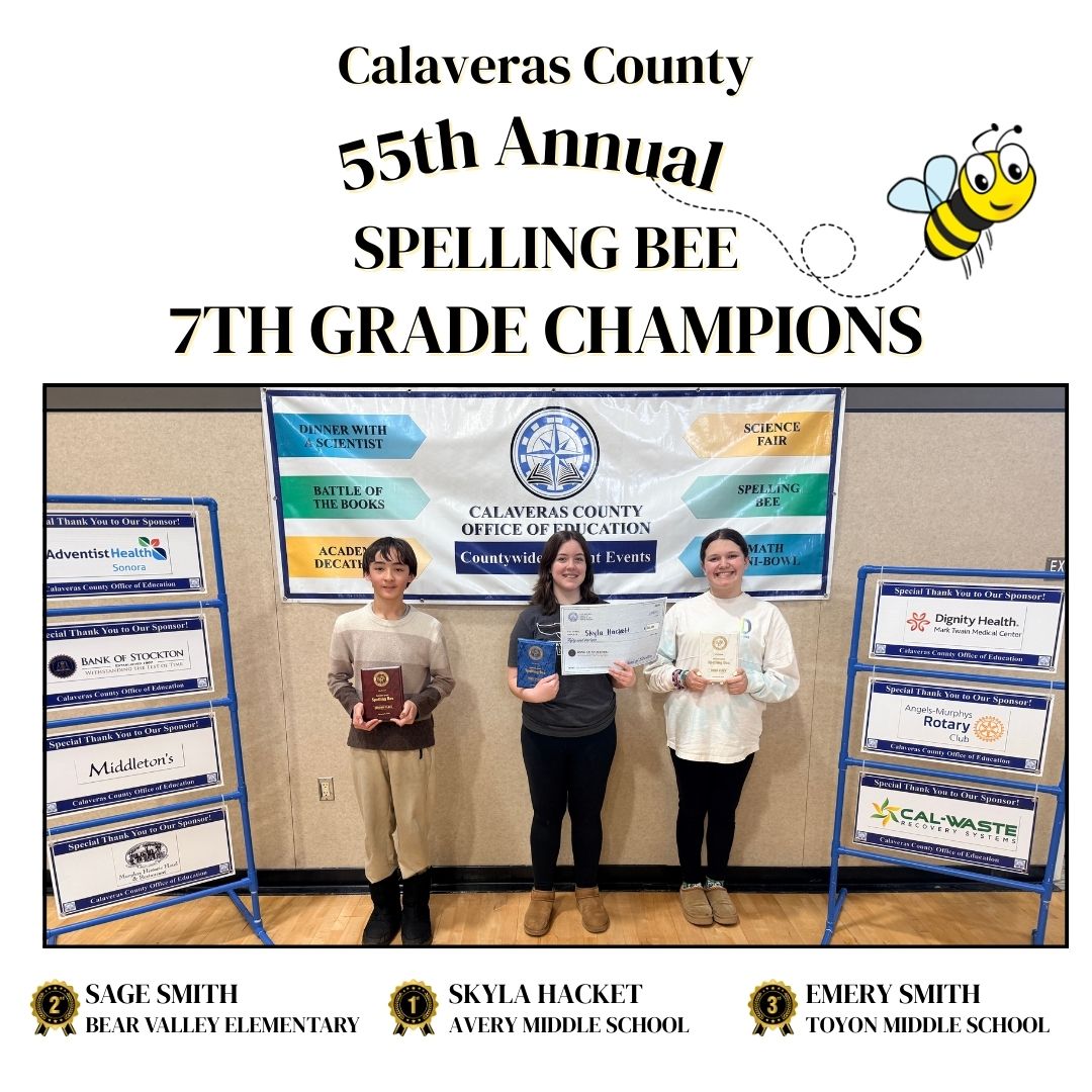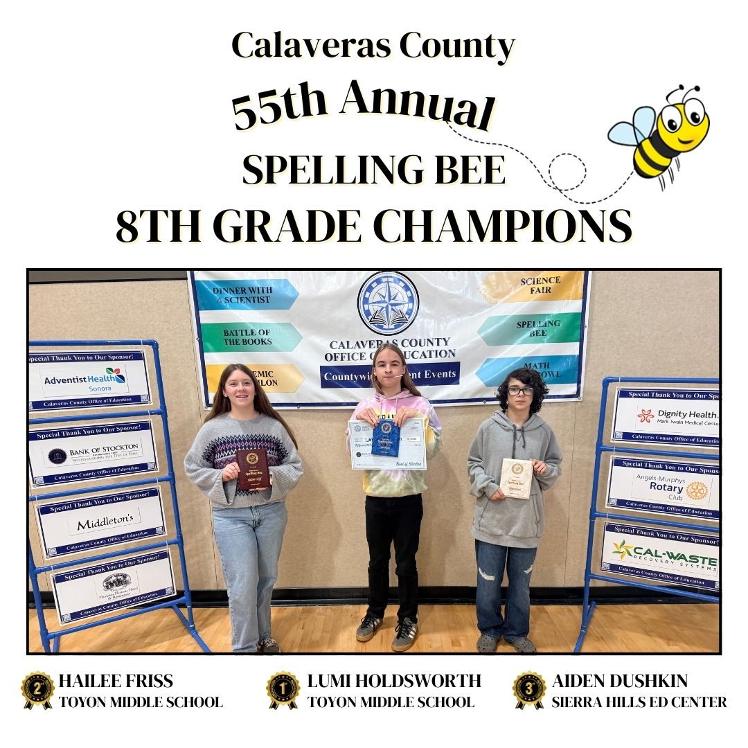 This year’s competition featured spellers representing Avery Middle School, Bear Valley Elementary, Calaveras River Academy, Copperopolis Elementary, Mark Twain Elementary, Sierra Hills Education Center, and Toyon Middle School. Organized by the Calaveras County Office of Education (CCOE), the annual event continues to highlight academic excellence and the dedication of students across the county.
