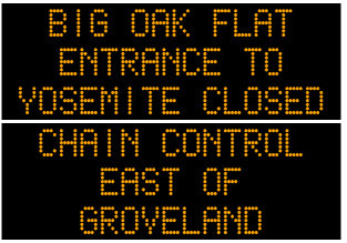 Chains are required on all vehicles except 4-wheel-drive vehicles with snow tires on all 4 wheels from 2.5 mi west of Groveland to Yosemite Nat’l Park Boundary (Tuolumne Co)