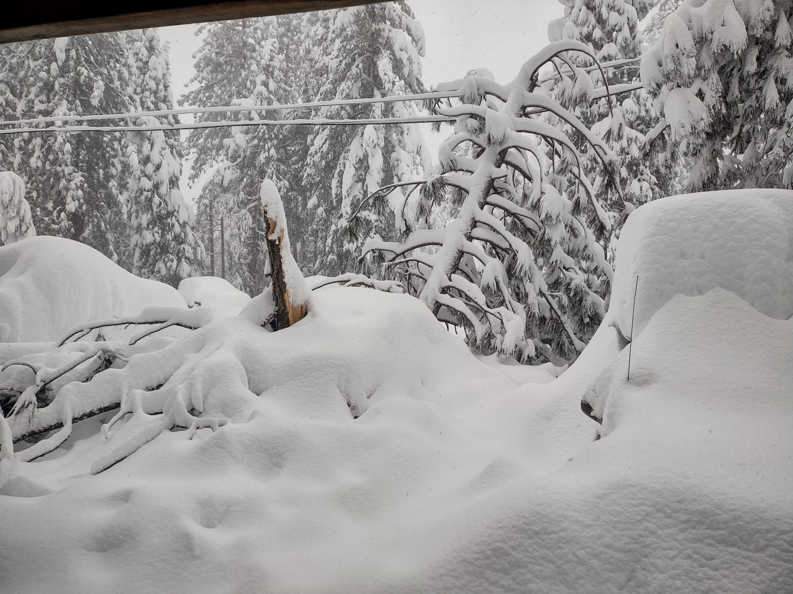 Arnold, CA…Whew…the great dig out has begun! Underneath the pile to the left is a Subaru with a tree stuck into the back seat and another portion of a tree stuck into the hood for good measure. Stakes through the heart for sure. Thankfully it was the only vehicle in the family with full coverage so while the wounds to the Subaru are definitely fatal there is yet hope for the vehicle’s owner.