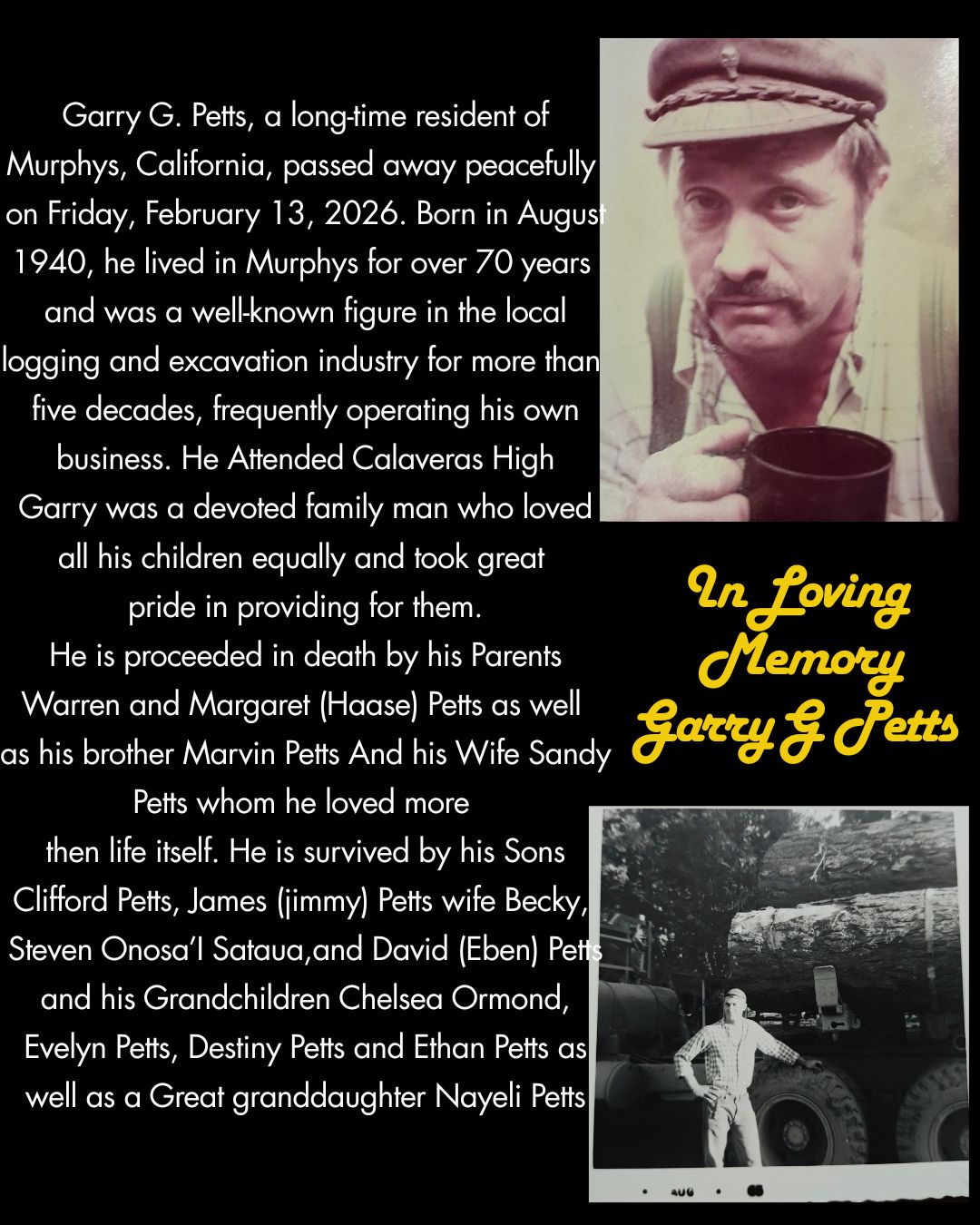 Murphys, CA…Garry G. Petts, a long-time resident of Murphys, California, passed away peacefully on Friday, February 13, 2026. Born in August 1940, he lived in Murphys for over 70 years and was a well-known figure in the local logging and excavation industry for more than five decades, frequently operating his own business. He Attended Calaveras High. Garry was a devoted family man who loved all his children equally and took great pride in providing for them.