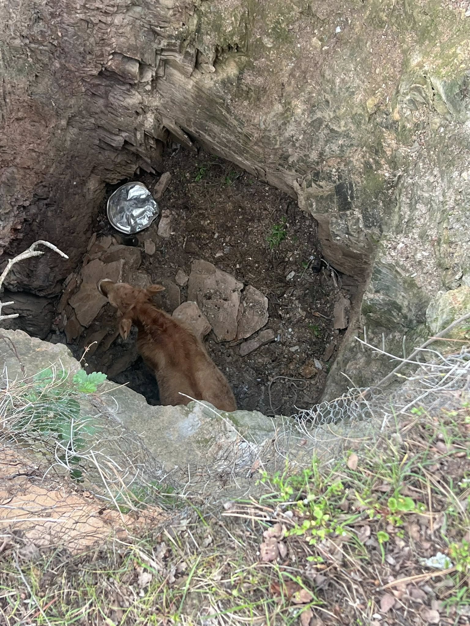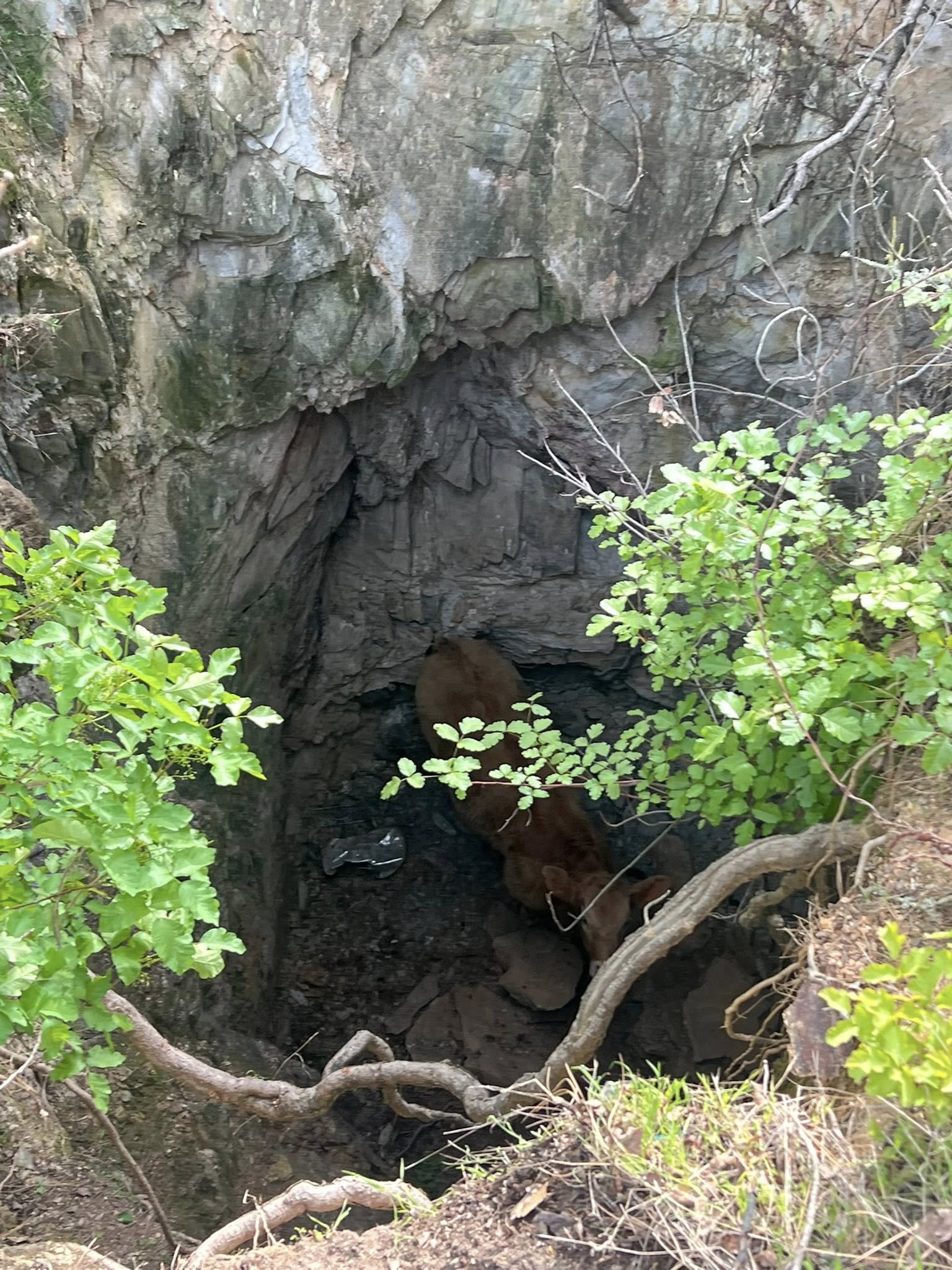 Firefighters located the calf 30 feet down the mine shaft. Momma cow was at the location and clearly concerned about her baby (Mooing!).
