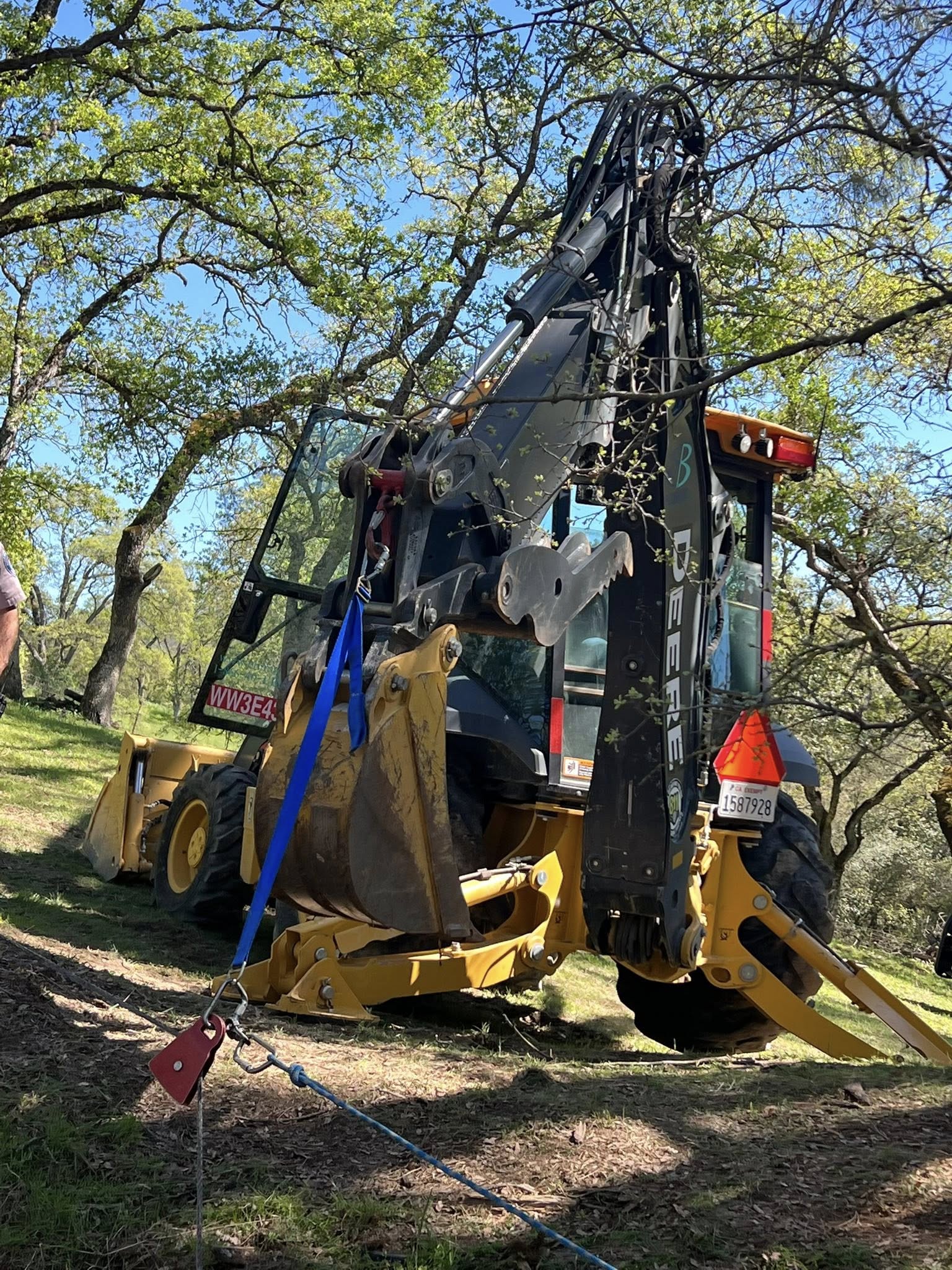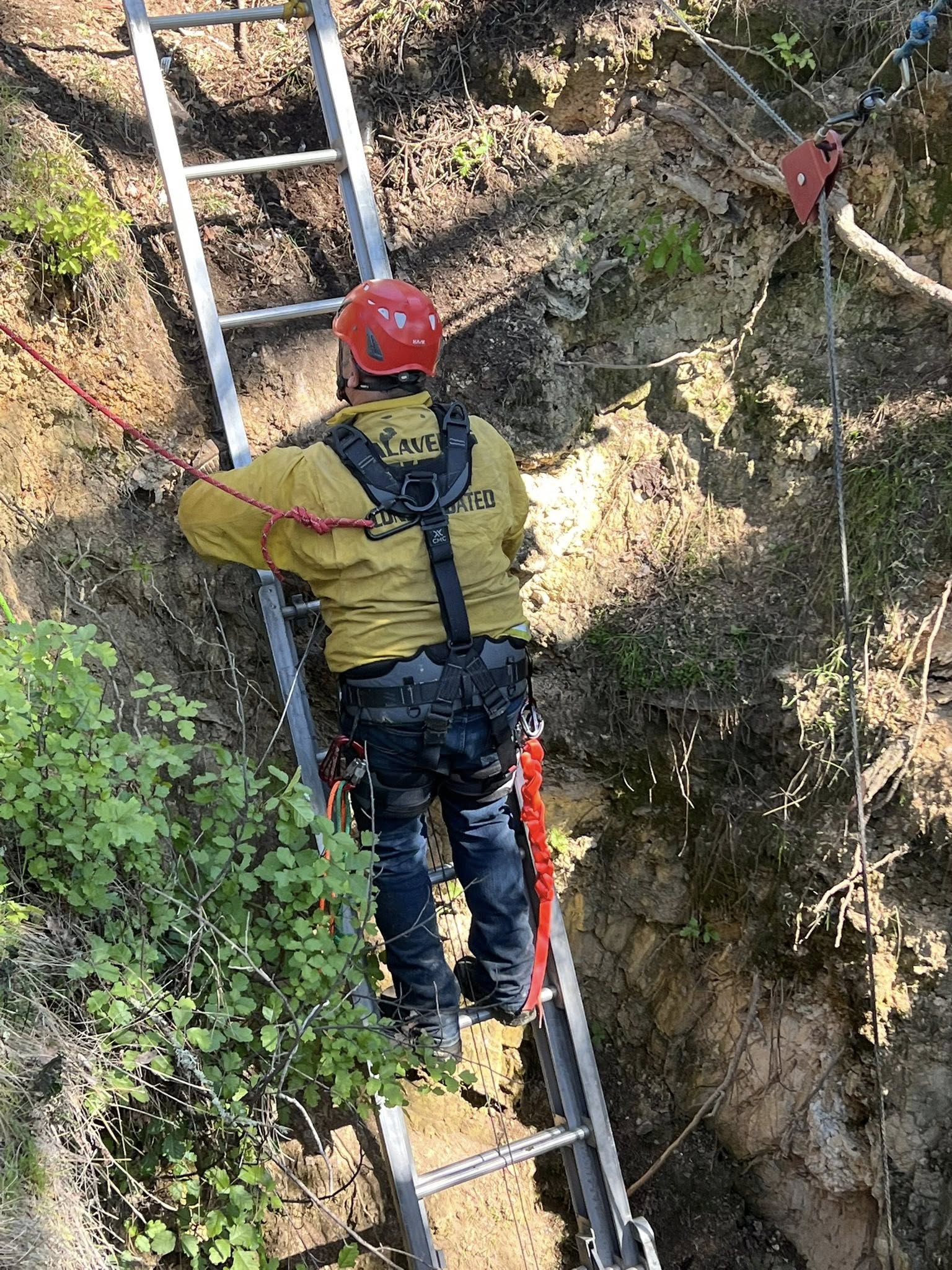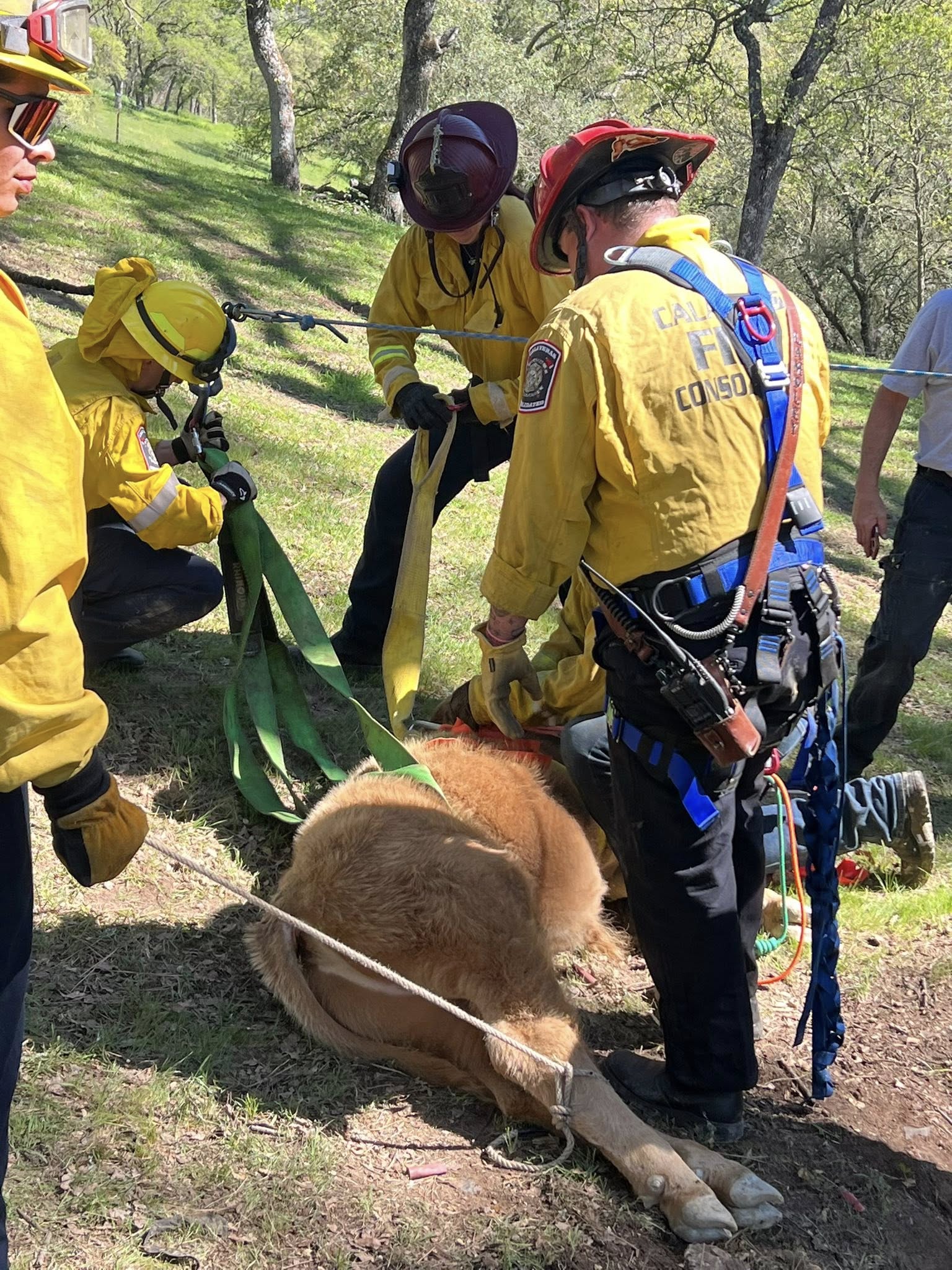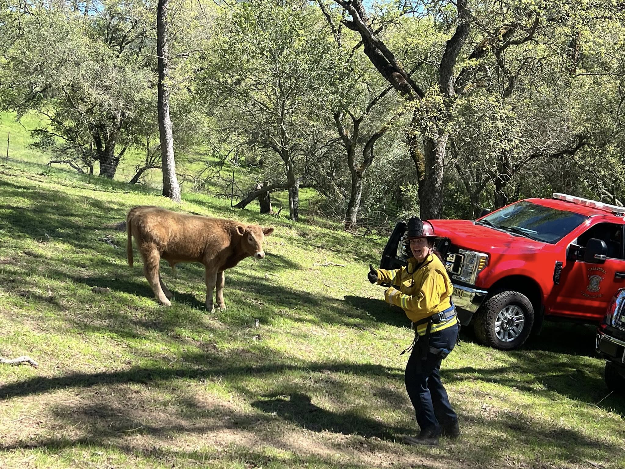 Campo Seco, CA…Firefighters from CALAVERAS CONSOLIDATED, CALFIRE, SAN ANDREAS FIRE, a backhoe loader from EBMUD, along with a former firefighter/rancher, Joe Butler, who specialized in large animal rescue, were successful in rescuing/removing a calf (yearling) from an abandoned mine shaft. The animal had fallen into the shaft/pit and was found by the owner.
