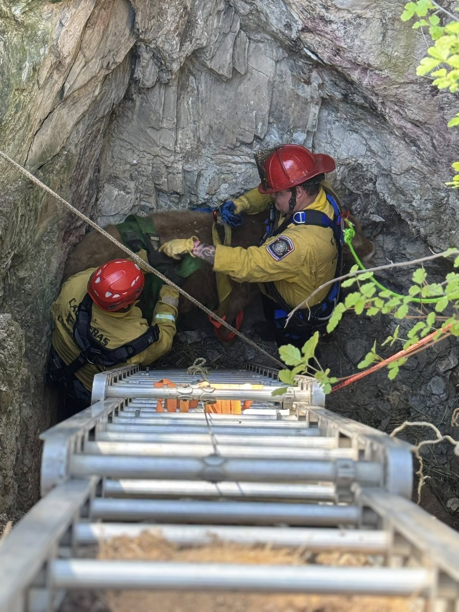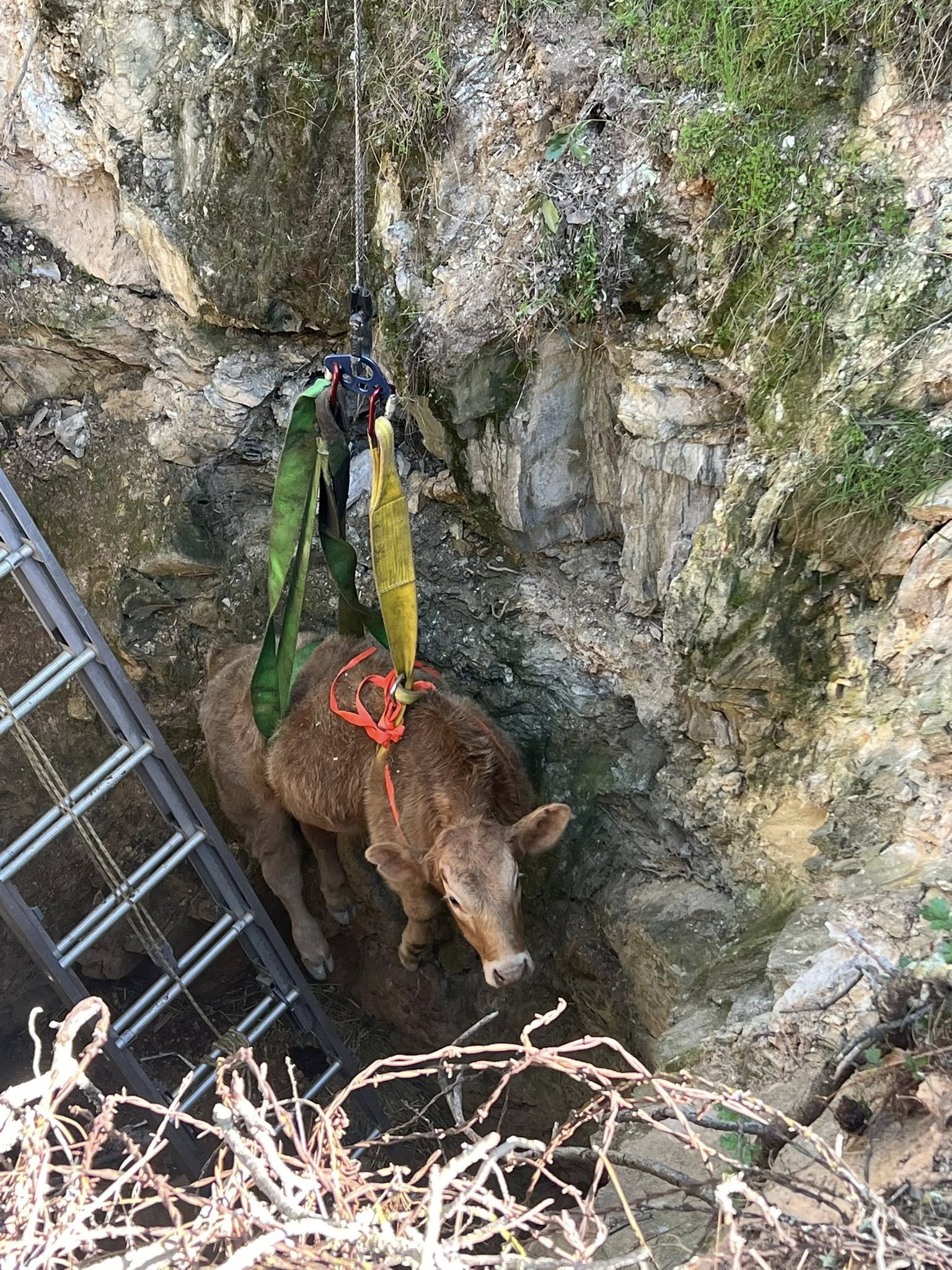 Today, crews set up a harness and rigging system to lift the calf out of the shaft.