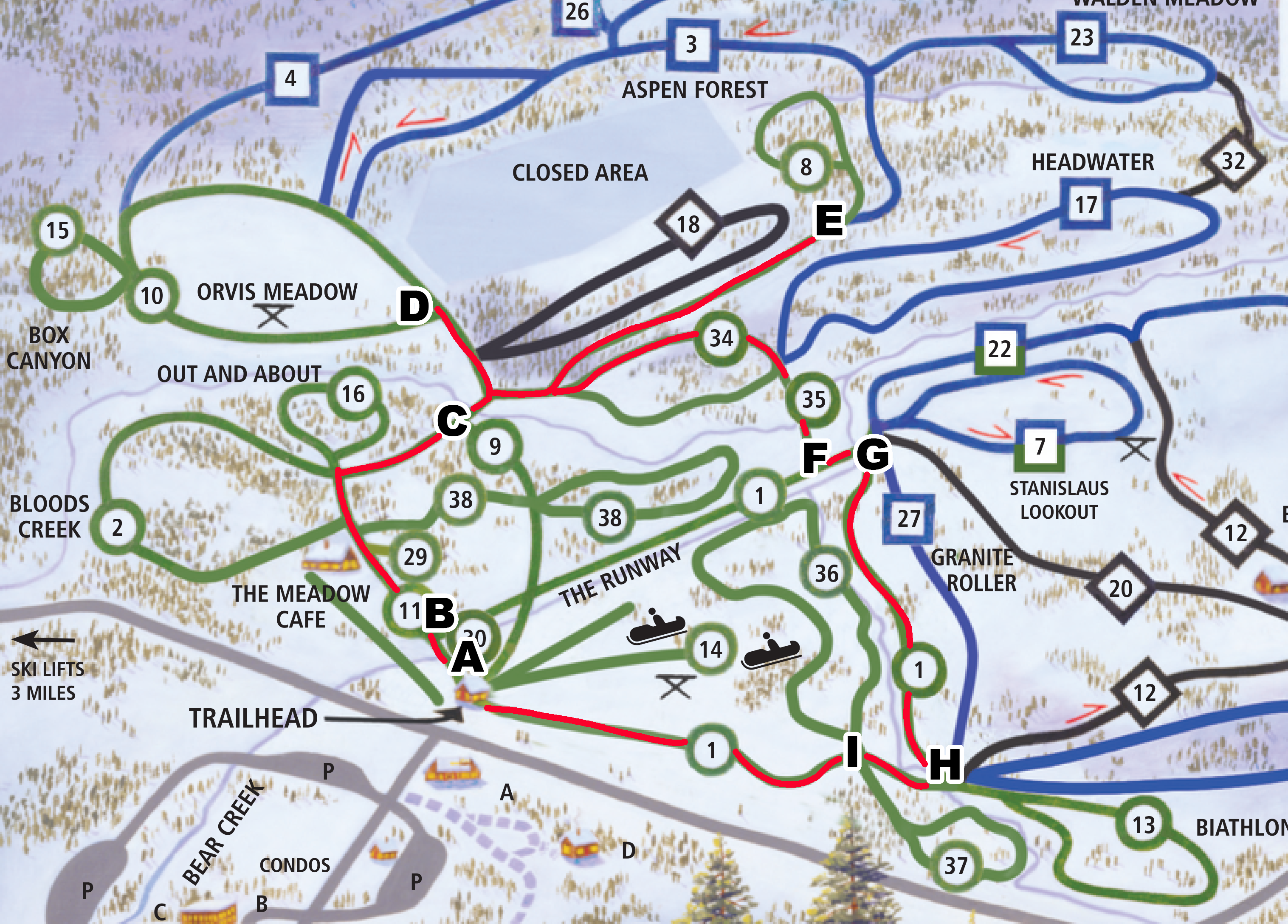 Bear Valley, CA…Welcome to the Bear Valley Natural History Tour. This adventure is designed for cross country skiers and snowshoers and follows beginner trails in the meadow. This tour can be done in succession or in any arrangement that works for you. The red route on the map is approximately 3 miles or 5 kilometers in length.