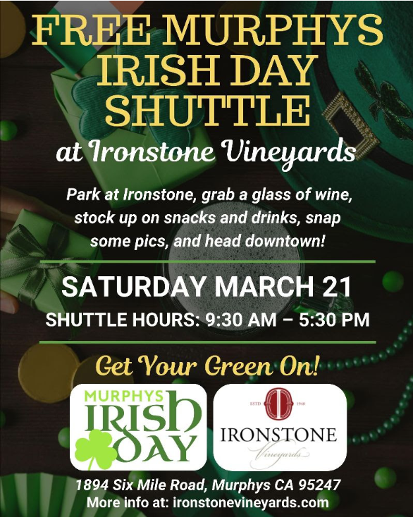 Share on Facebook Follow on Facebook Add to Google+ Connect on Linked in Subscribe by Email Print This Post Murphys, CA…Free Murphys Irish Day Shuttle from Ironstone! Free Murphys Irish Day Shuttle from Ironstone! added by admin on March 20, 2026 12:03 pm –View all posts by admin → Related