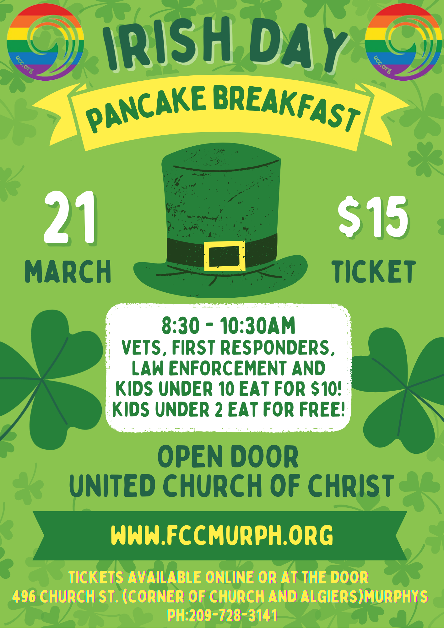 Murphys, CA…We invite you to our annual Irish Day Pancake Breakfast. Bring the family and enjoy a wonderful meal before heading out to the Murphys Irish Day Parade. Tickets are $15 each, $10 for kids under 10. Vets, first responders, law enforcement, and kids under 2 eat for free. Purchase tickets at www.fccmurph.org. Call (209)728-3141 or email nugget@fccmurph.org for more information.