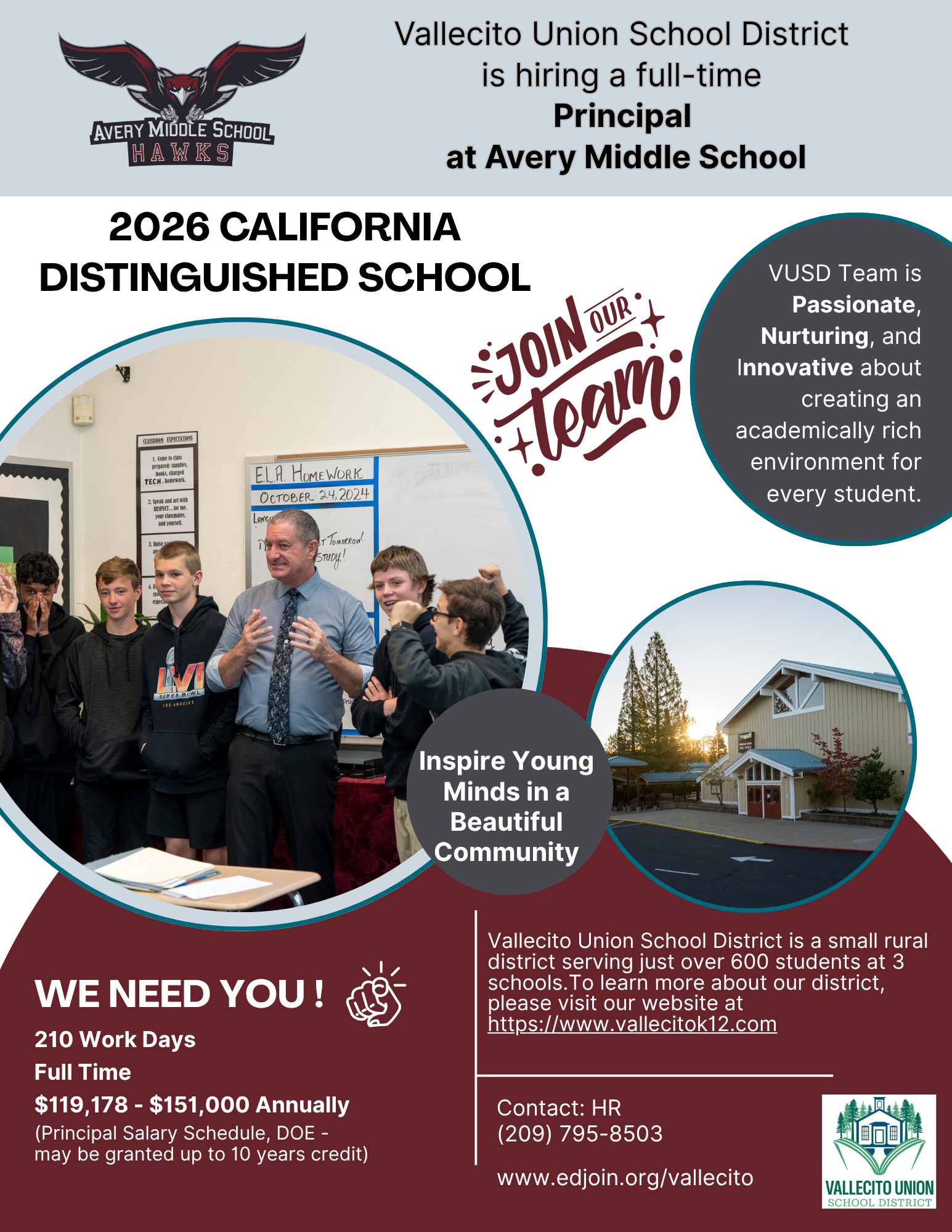 Avery, CA…Vallecito Union School District is seeking a dynamic, personable, and student-centered leader to serve as Principal of Avery Middle School beginning in the 2026-2027 school year.