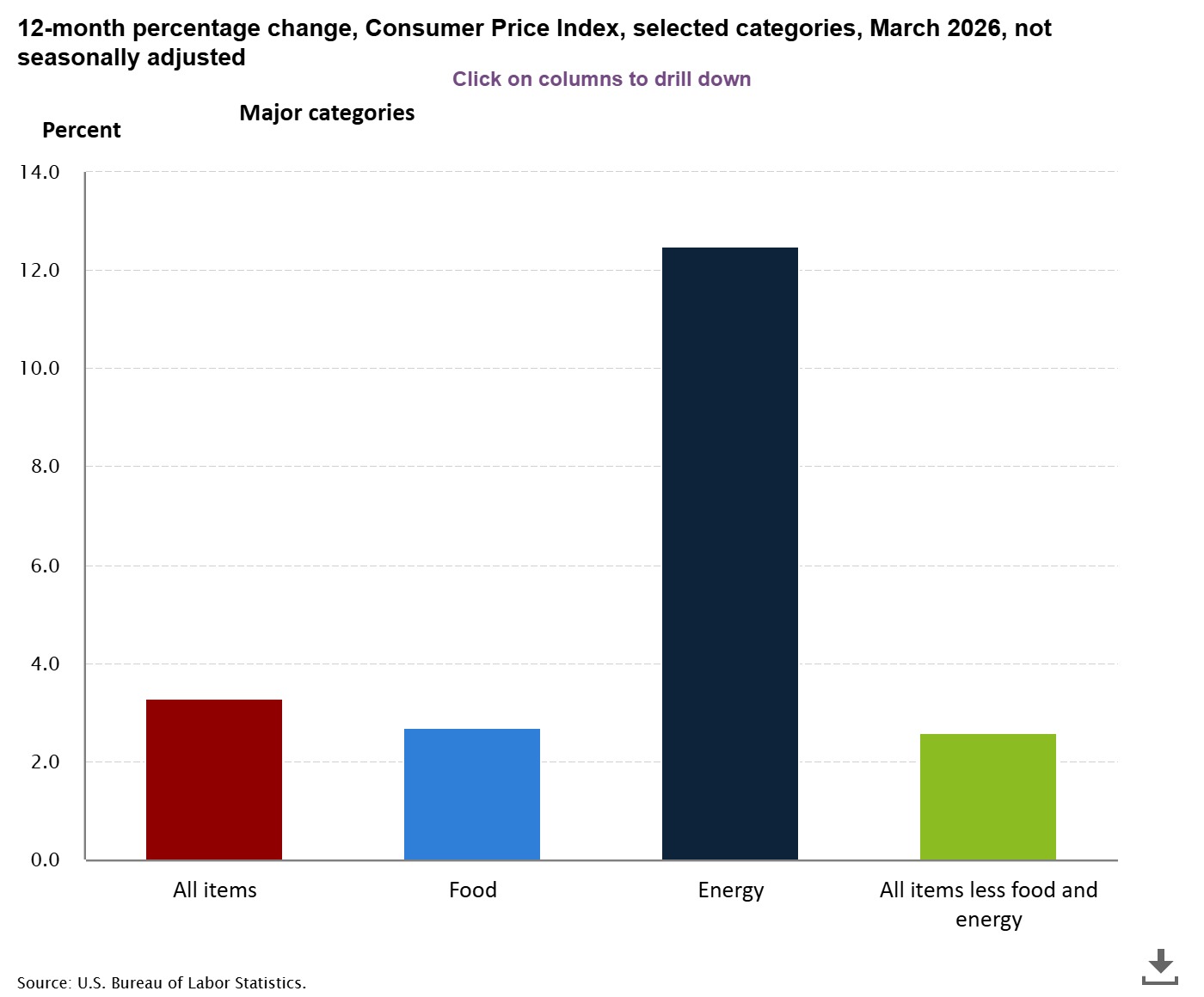 Food The index for food was unchanged in March after rising 0.4 percent in February. The food at home index declined 0.2 percent over the month. Four of the six major grocery store food group indexes decreased in March. The index for meats, poultry, fish, and eggs decreased 0.6 percent over the month as the index for eggs declined 3.4 percent. The cereals and bakery products index also decreased 0.6 percent in March, as did the dairy and related products index. The index for nonalcoholic beverages fell 0.3 percent over the month. In contrast, the fruits and vegetables index rose 1.0 percent in March. The index for other food at home was unchanged over the month. The food away from home index rose 0.2 percent in March. The index for full service meals rose 0.3 percent over the month and the index for limited service meals rose 0.2 percent. The food at home index rose 1.9 percent over the 12 months ending in March. The index for other food at home rose 2.9 percent over the last 12 months. The fruits and vegetables index increased 4.0 percent over the same period and the nonalcoholic beverages index rose 4.7 percent. The index for cereals and bakery products increased 2.1 percent over the 12 months ending in March. In contrast, the dairy and related products index fell 1.6 percent over the year and the meats, poultry, fish, and eggs index decreased 0.9 percent over the same period. The food away from home index rose 3.8 percent over the last year. The index for full service meals rose 4.3 percent and the index for limited service meals rose 3.2 percent over the same period. Energy The index for energy increased 10.9 percent in March, the largest monthly increase in the index since September 2005. The gasoline index increased 21.2 percent over the month, the largest monthly increase since the series was first published in 1967. (Before seasonal adjustment, gasoline prices increased 24.9 percent in March.) The index for electricity rose 0.8 percent in March. The fuel oil index increased 30.7 percent over the month, the largest monthly increase in the index since February 2000. Conversely, the index for natural gas decreased 0.9 percent over the month. The index for energy increased 12.5 percent over the past 12 months and the index for gasoline rose 18.9 percent. The electricity index increased 4.6 percent over the last 12 months and the natural gas index rose 6.4 percent. All items less food and energy The index for all items less food and energy rose 0.2 percent in March, as it did in February. The shelter index increased 0.3 percent over the month as did the owners' equivalent rent index. The index for rent increased 0.2 percent in March. The lodging away from home index rose 0.2 percent over the month. The index for airline fares increased 2.7 percent over the month, after rising 1.4 percent in February. The apparel index rose 1.0 percent in March and the household furnishings and operations index rose 0.2 percent. The index for education rose 0.3 percent over the month and the index for new vehicles rose 0.1 percent in March. The medical care index decreased 0.2 percent in March, after rising 0.5 percent in February. The index for prescription drugs decreased 1.5 percent over the month. Conversely, the physicians' services index increased 0.7 percent over the month and the hospital services index rose 0.4 percent. The personal care index declined 0.5 percent in March and the used cars and trucks index decreased 0.4 percent over the month. The index for recreation and the index for motor vehicle insurance were both unchanged over the month. The index for all items less food and energy rose 2.6 percent over the past 12 months. The shelter index increased 3.0 percent over the last year. Other indexes with notable increases over the last year include medical care (+3.1 percent), household furnishings and operations (+4.0 percent), airline fares (+14.9 percent), and recreation (+2.2 percent). Not seasonally adjusted CPI measures The Consumer Price Index for All Urban Consumers (CPI-U) increased 3.3 percent over the last 12 months to an index level of 330.213 (1982-84=100). For the month, the index increased 1.0 percent prior to seasonal adjustment. The Consumer Price Index for Urban Wage Earners and Clerical Workers (CPI-W) increased 3.3 percent over the last 12 months to an index level of 323.500 (1982-84=100). For the month, the index increased 1.3 percent prior to seasonal adjustment. The Chained Consumer Price Index for All Urban Consumers (C-CPI-U) increased 3.1 percent over the last 12 months. For the month, the index increased 1.1 percent on a not seasonally adjusted basis. Please note that the indexes for the past 10 to 12 months are subject to revision. _______________ The Consumer Price Index for April 2026 is scheduled to be released on Tuesday, May 12, 2026, at 8:30 a.m. (ET).
