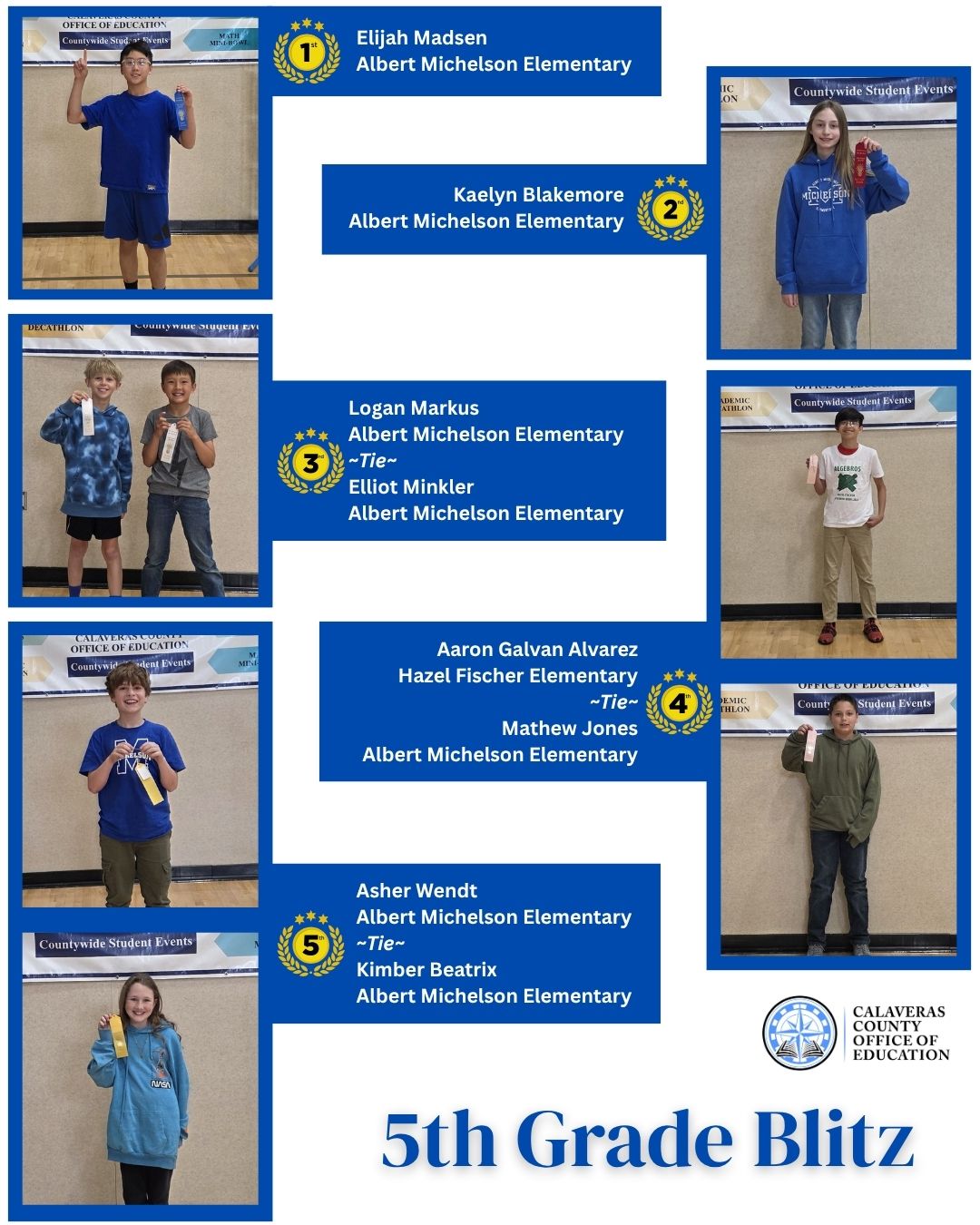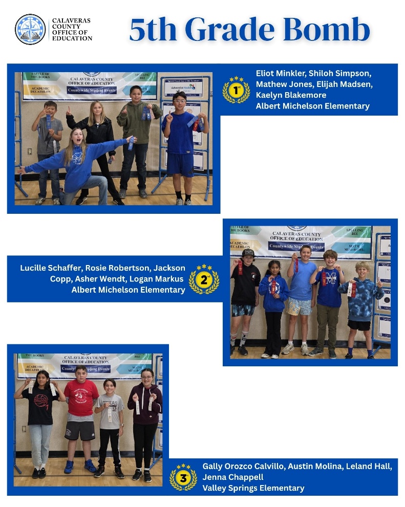 In the fifth-grade division, students from Albert Michelson Elementary delivered a strong showing across all three events. Elijah Madsen earned first place in the Blitz, while Eliot Minkler and Matthew Jones teamed up to secure first place in the Huddle. Albert Michelson also claimed the top spot in the Bomb team competition.