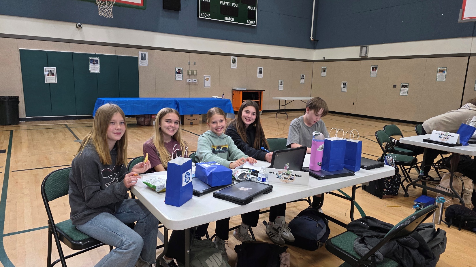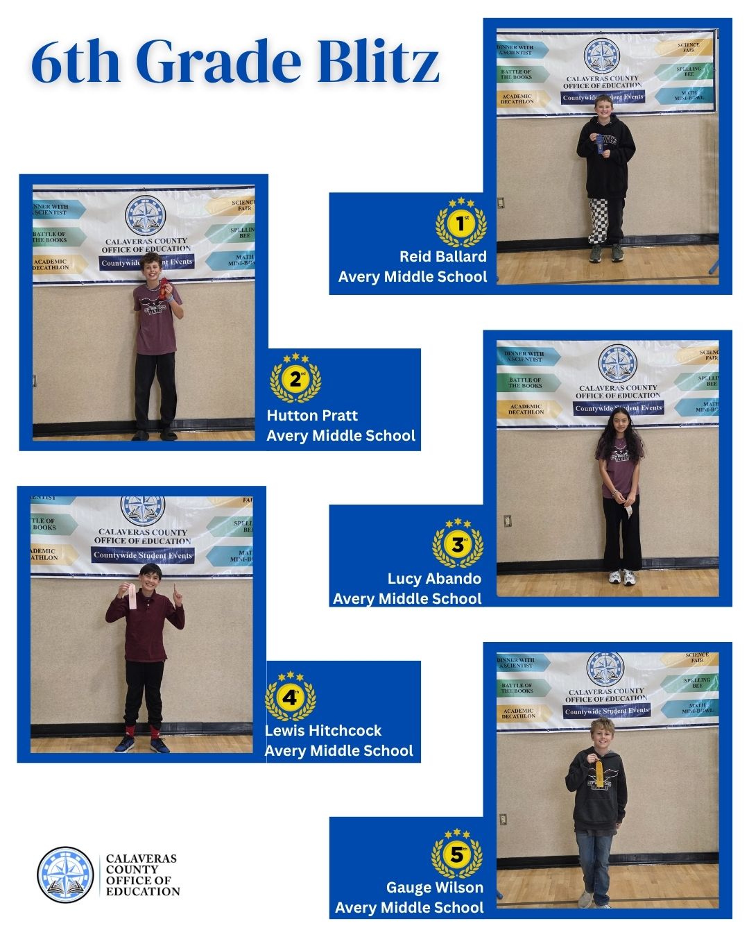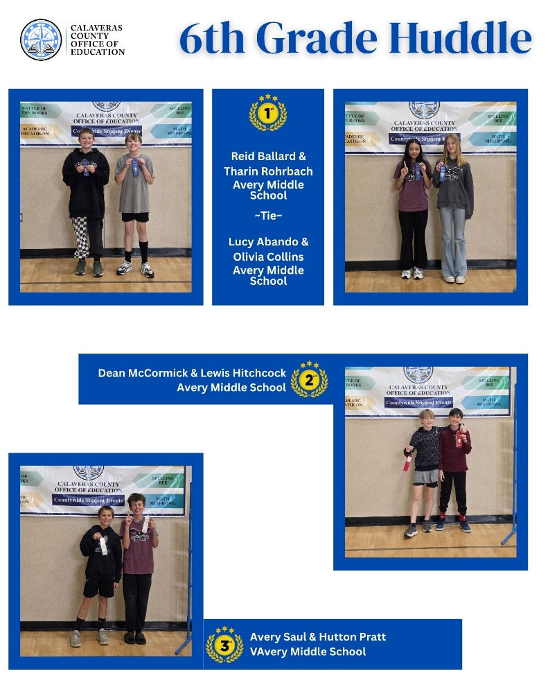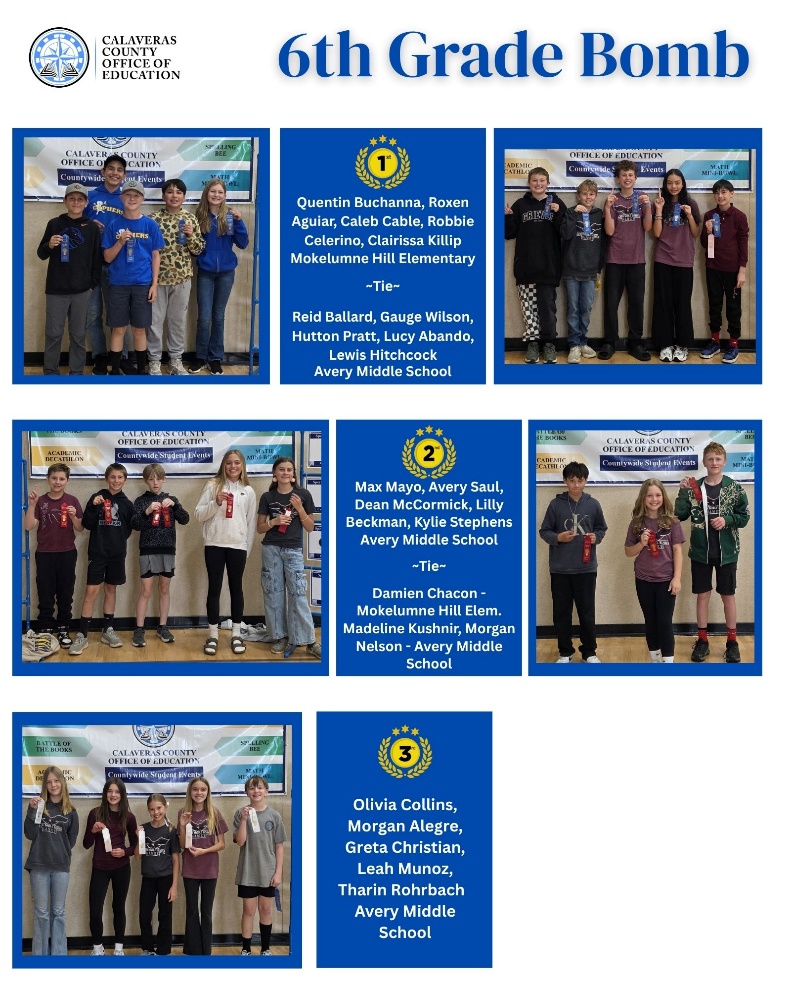The sixth-grade division was led by Avery Middle School and Mokelumne Hill Elementary. Reid Ballard of Avery Middle School earned first place in the Blitz. In the Huddle, a tie for first place was awarded to the teams of Olivia Collins and Lucy Abando, and Reid Ballard and Tharin Rohrbach, all representing Avery Middle School. In the Bomb competition, Mokelumne Hill Elementary and Avery Middle School shared a first-place tie.