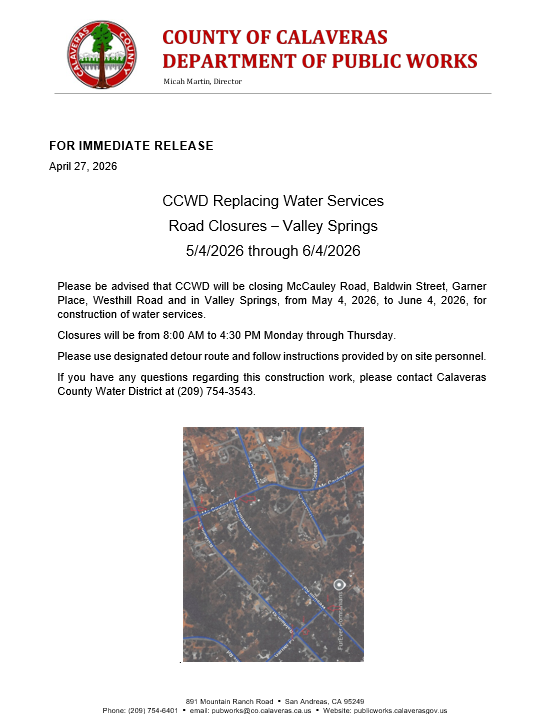 Valley Springs, CA…5/4/2026 through 6/4/2026Please be advised that CCWD will be closing McCauley Road, Baldwin Street, Garner Place, Westhill Road and in Valley Springs, from May 4, 2026, to June 4, 2026, for construction of water services.