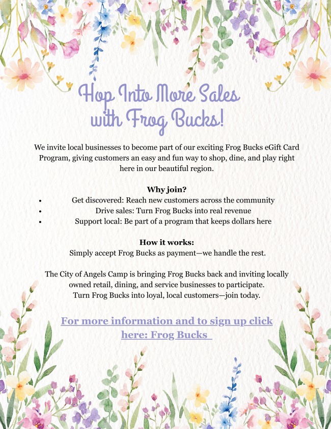 Angels Camp, CA…The City of Angels Camp invites local businesses to become part of our exciting Frog Bucks eGift Card Program, giving customers an easy and fun way to shop, dine, and play right here in our beautiful region.