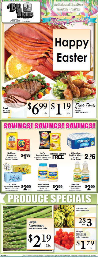 Share on Facebook Follow on Facebook Add to Google+ Connect on Linked in Subscribe by Email Print This Post Big Trees Market Weekly Ad & Specials. Happy Easter! Larger Images Are Below Big Trees Market Weekly Ad & Specials Through April 3rd Happy Easter! added by admin on March 28, 2018 7:46 am –View all posts by admin → Related